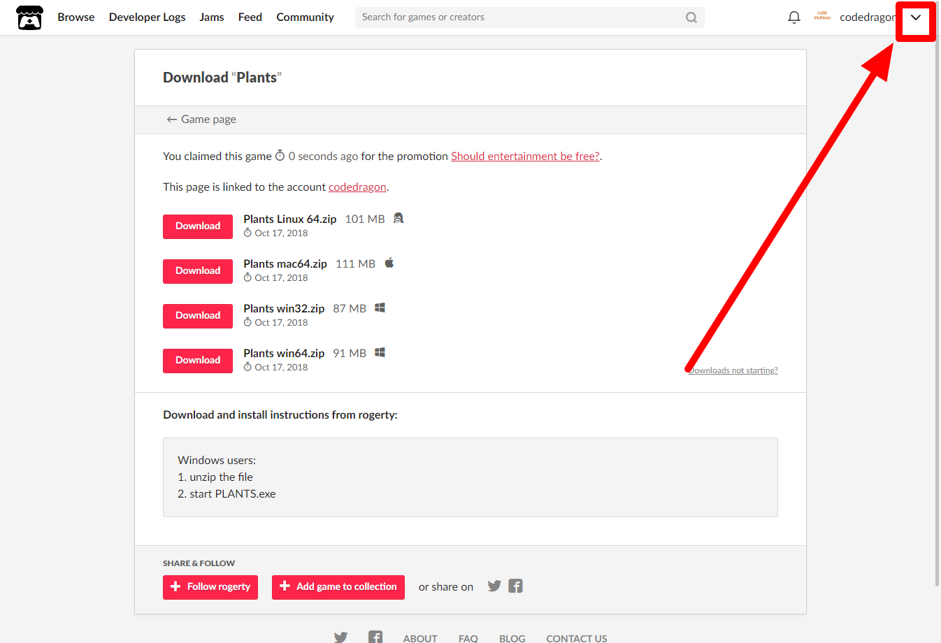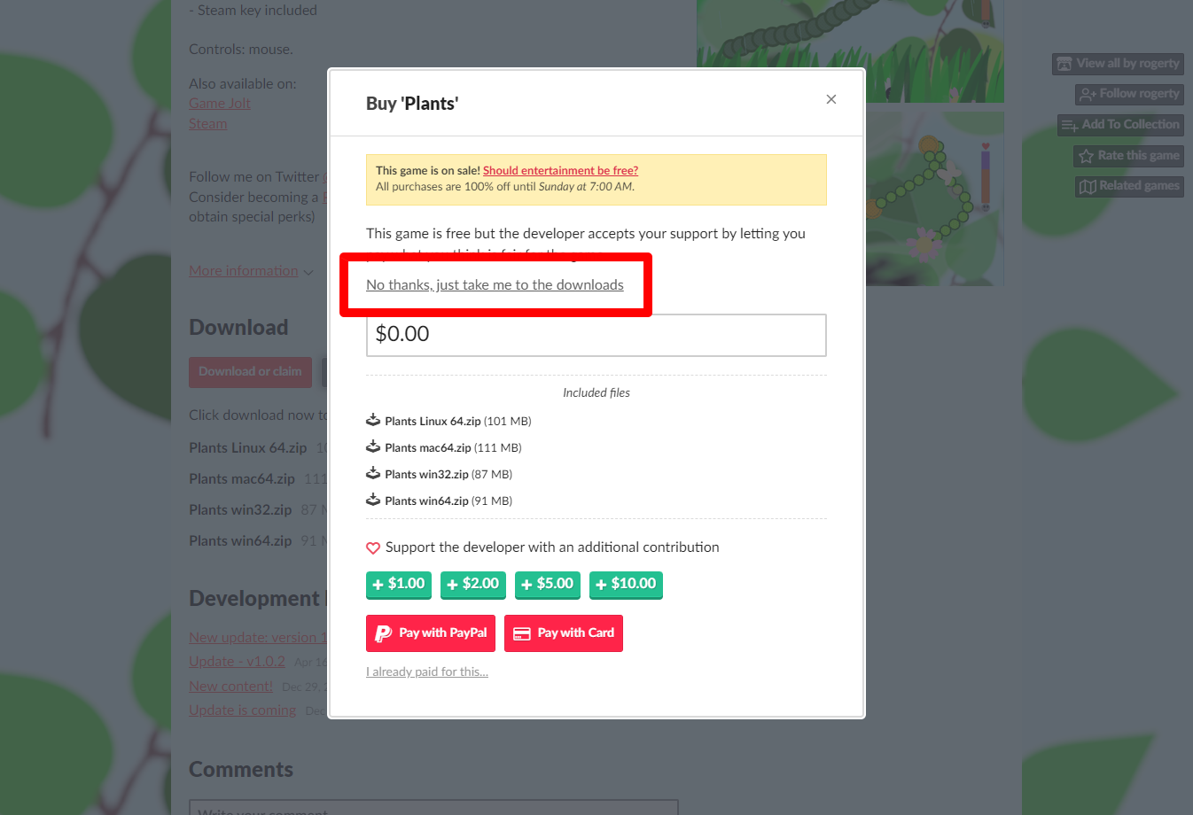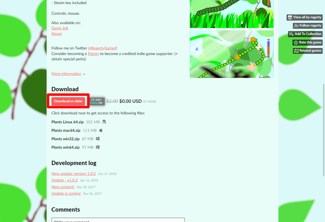 "Plants" 페이지 내려서 [Download or claim]을 클릭합니다.