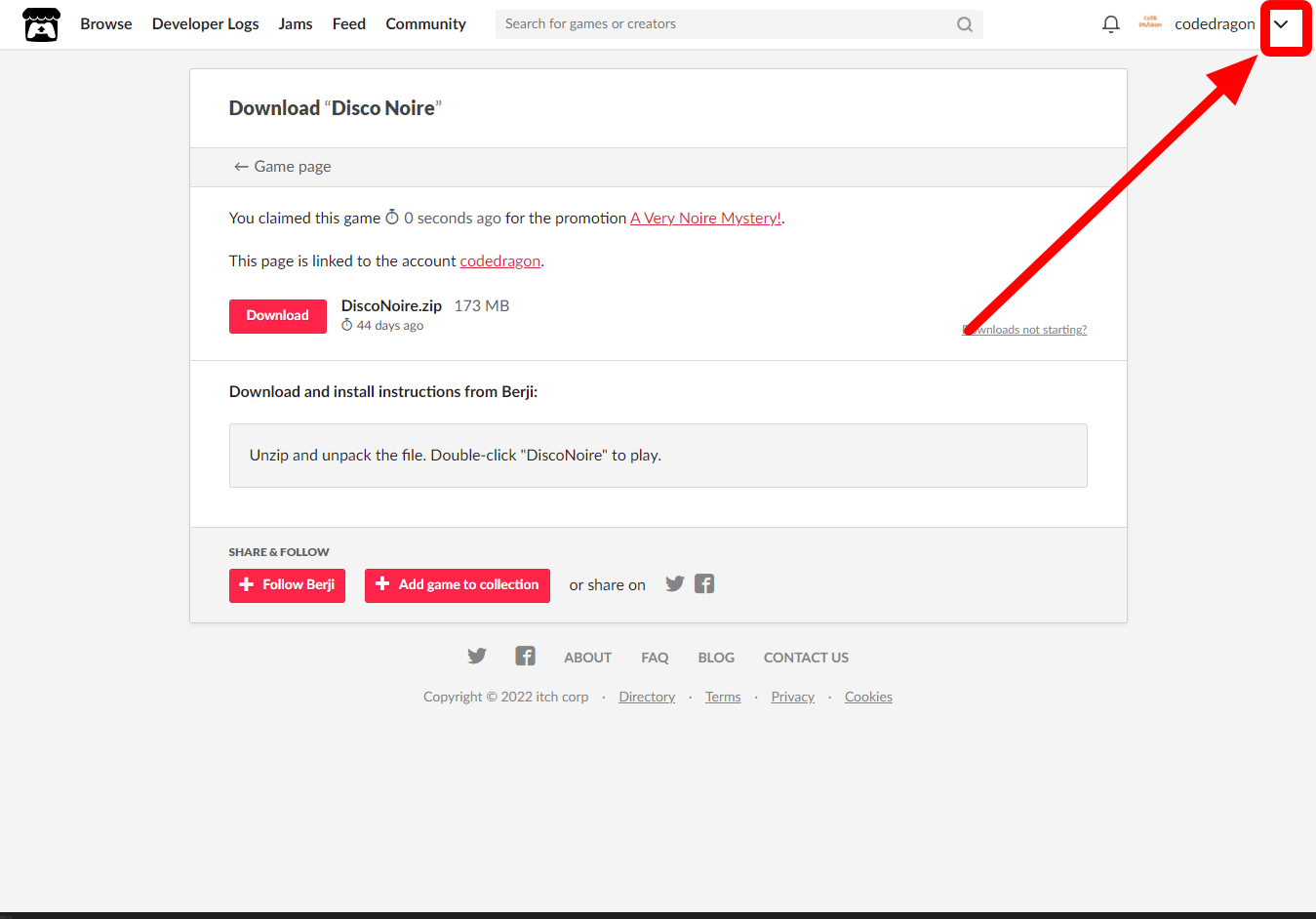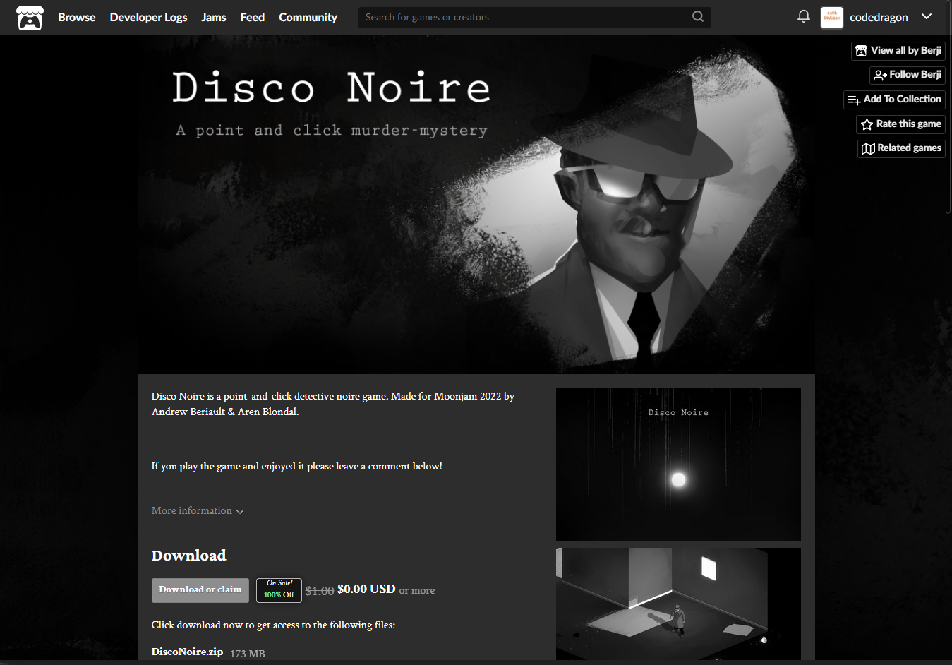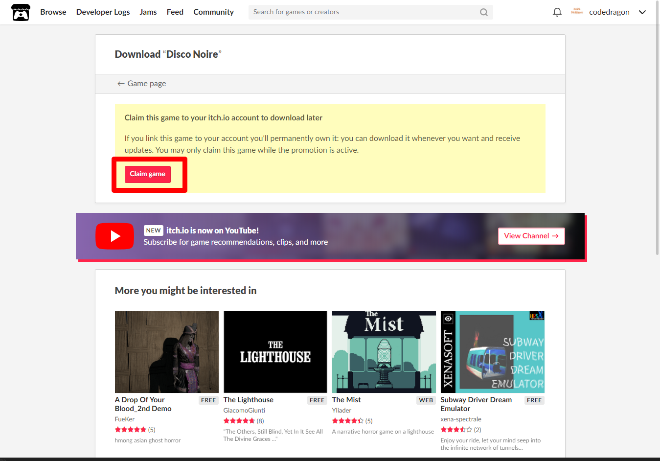 "Disco Noire" 페이지에 있는 [Download or claim]을 클릭합니다.