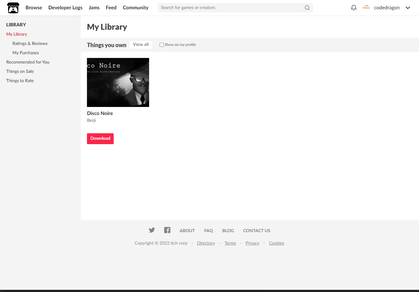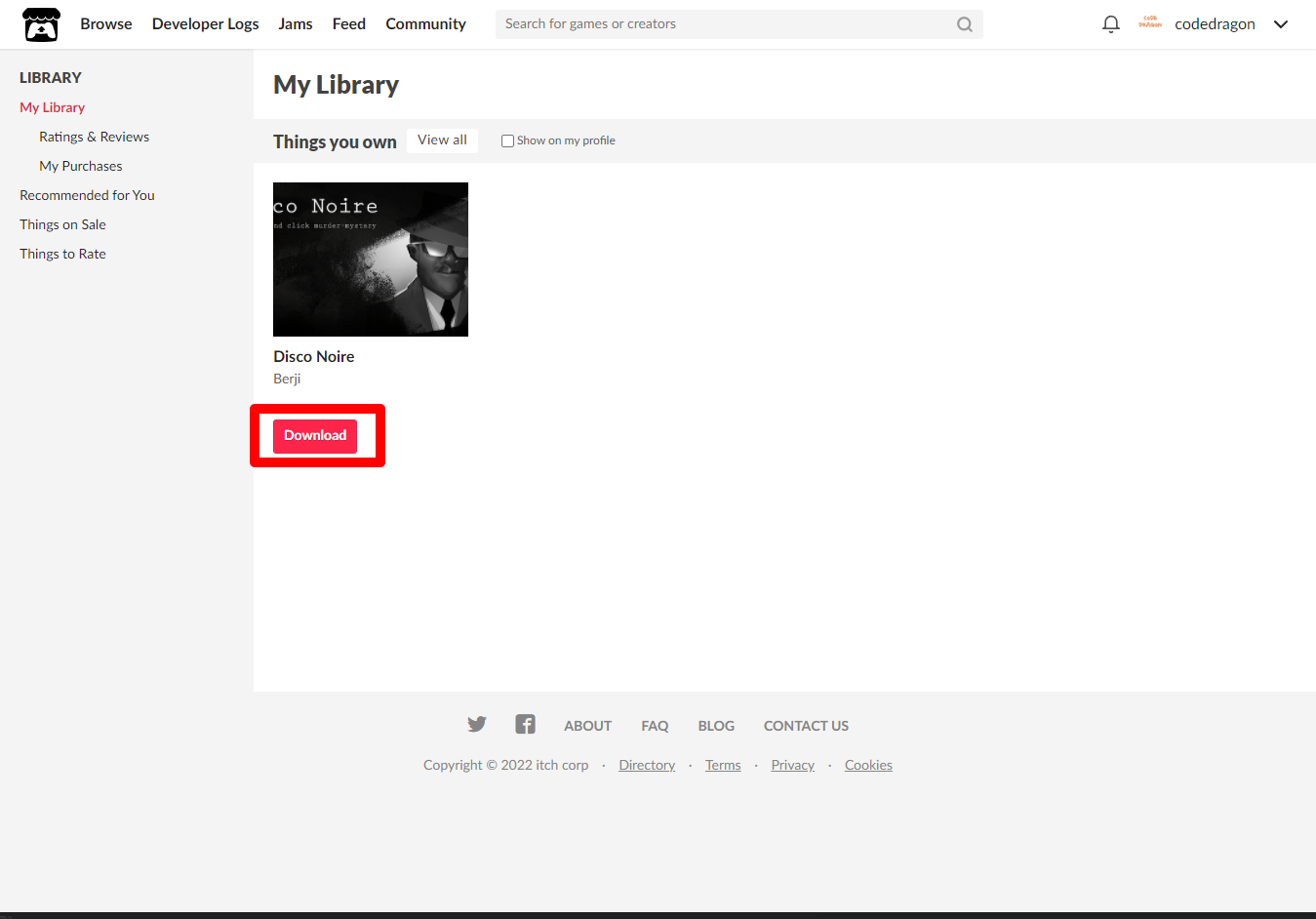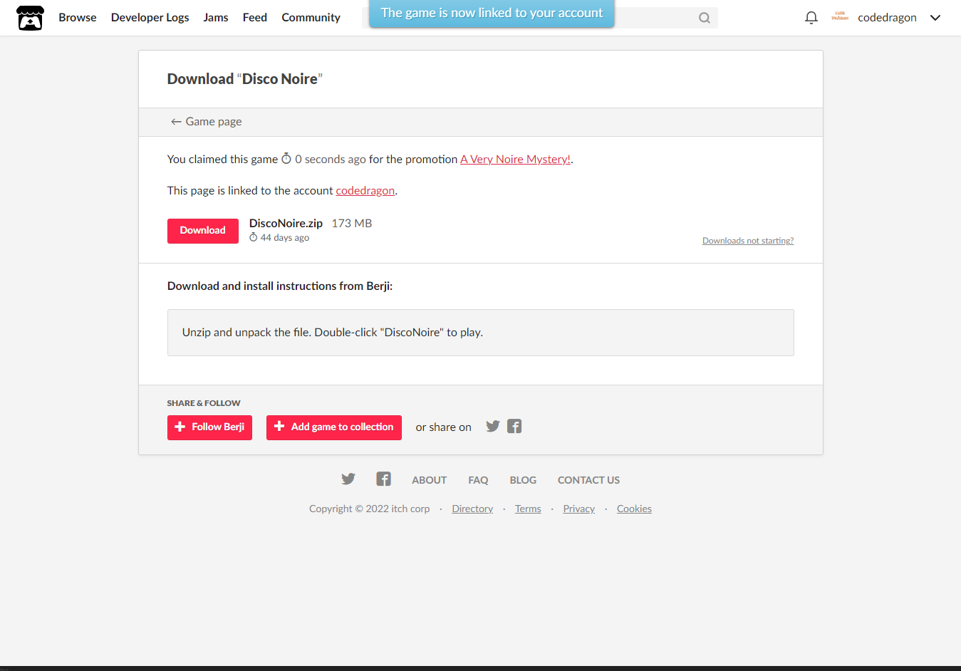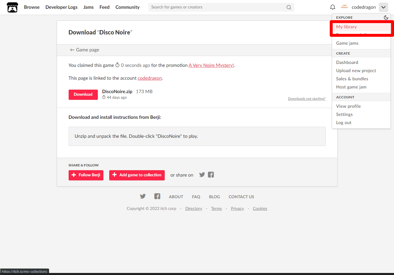 [Claim game]을 클릭하면 "Disco Noire" 게임이 나의 게임 라이브러리에 추가되고 설치파일을 다운받을 수 있는 페이지로 이동됩니다.