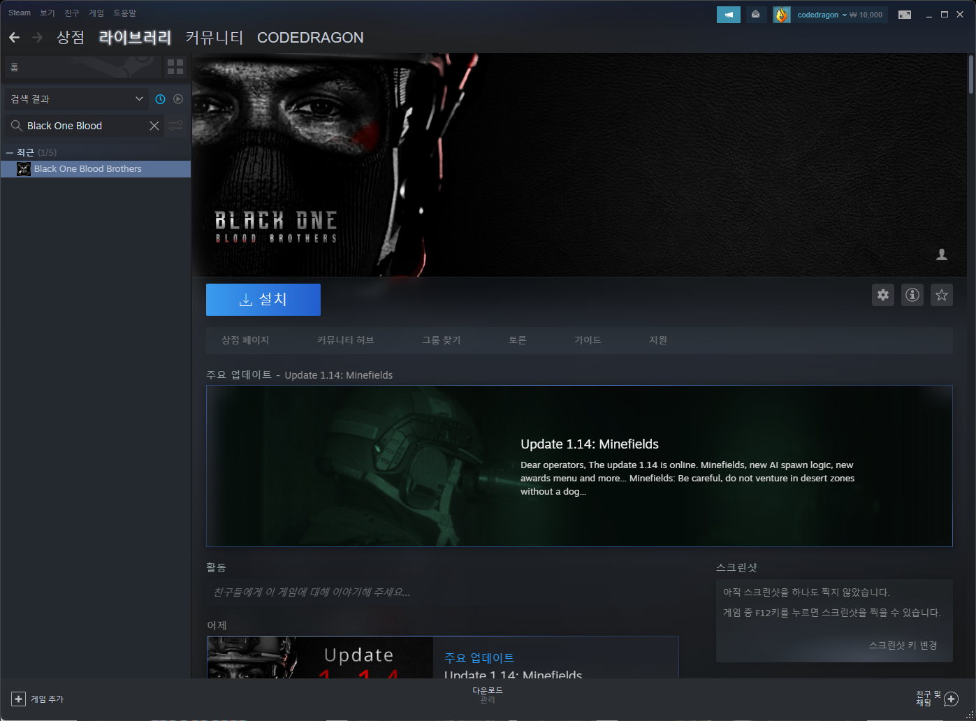나의 게임 라이브러리에서 등록한 "Black One Blood Brothers" 항목을 확인할 수 있습니다
