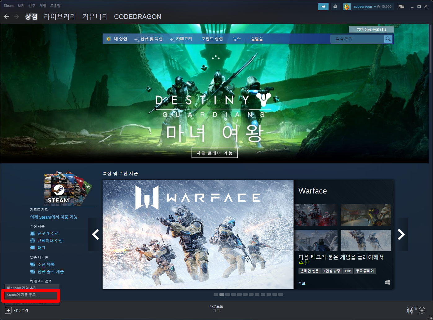 나오는 메뉴에서 [Steam에 제품 등록]을 클릭합니다.
