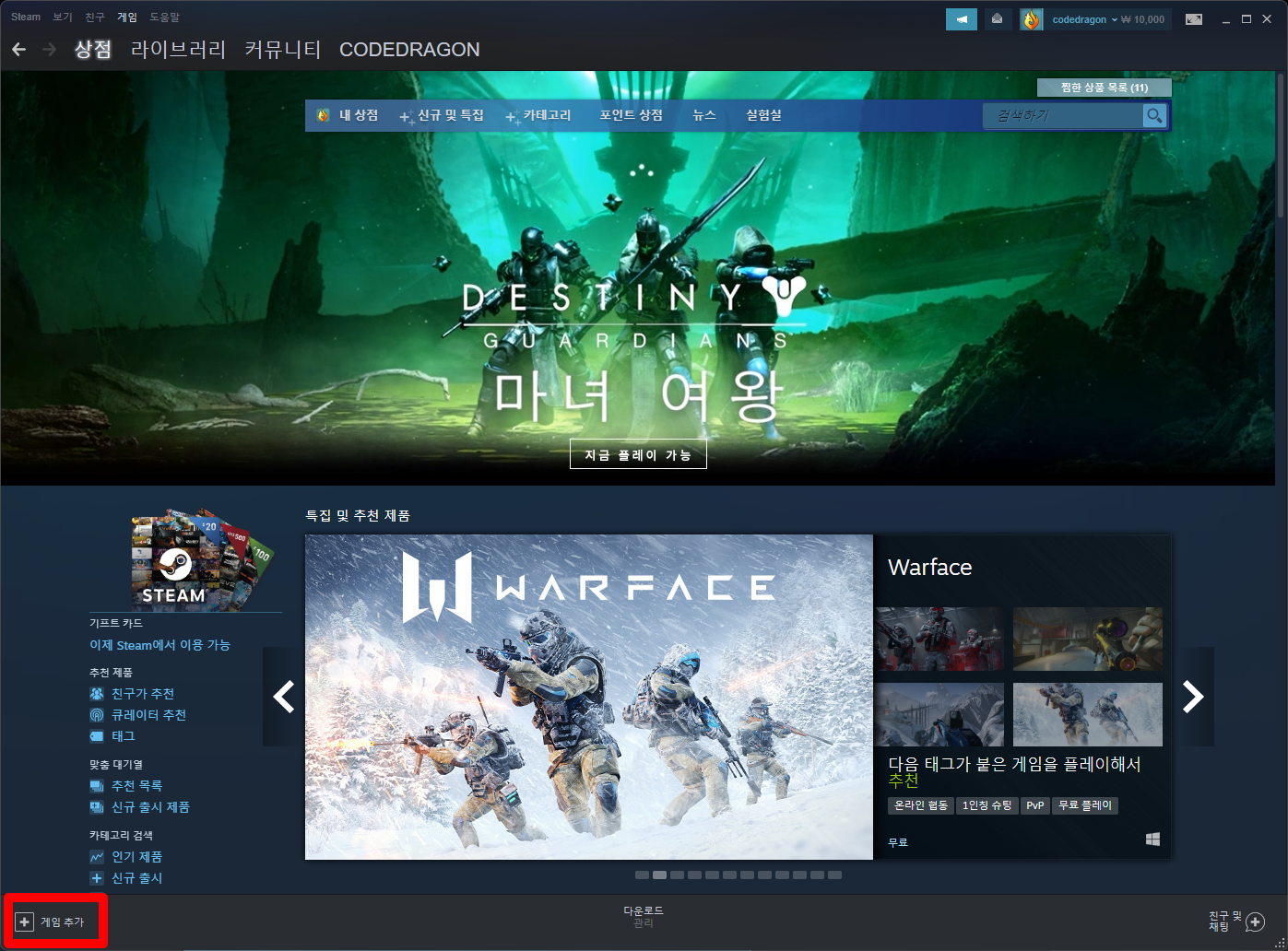 스팀 런처에서 상단에 있는 [라이브러리] 메뉴를 클릭합니다.
