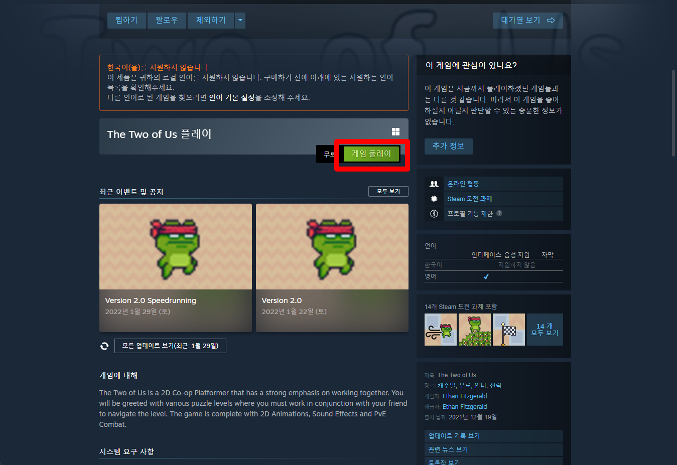 "The Two of Us" 페이지를 내려 [게임 플레이]를 클릭하면 됩니다.