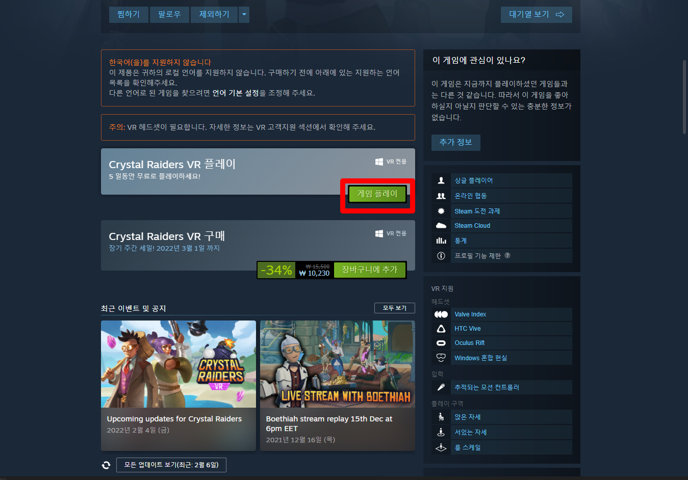 "Crystal Raiders VR" 게임페이지를 조금 내려서 [게임 플레이] 버튼을 클릭하면 됩니다.