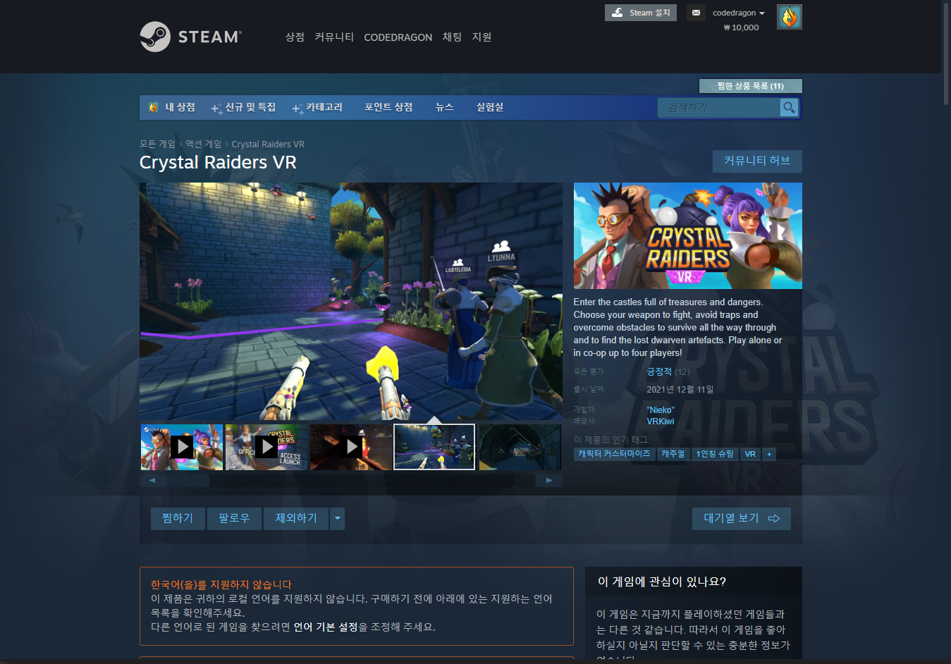 "Crystal Raiders VR" 게임페이지에 접속합니다.