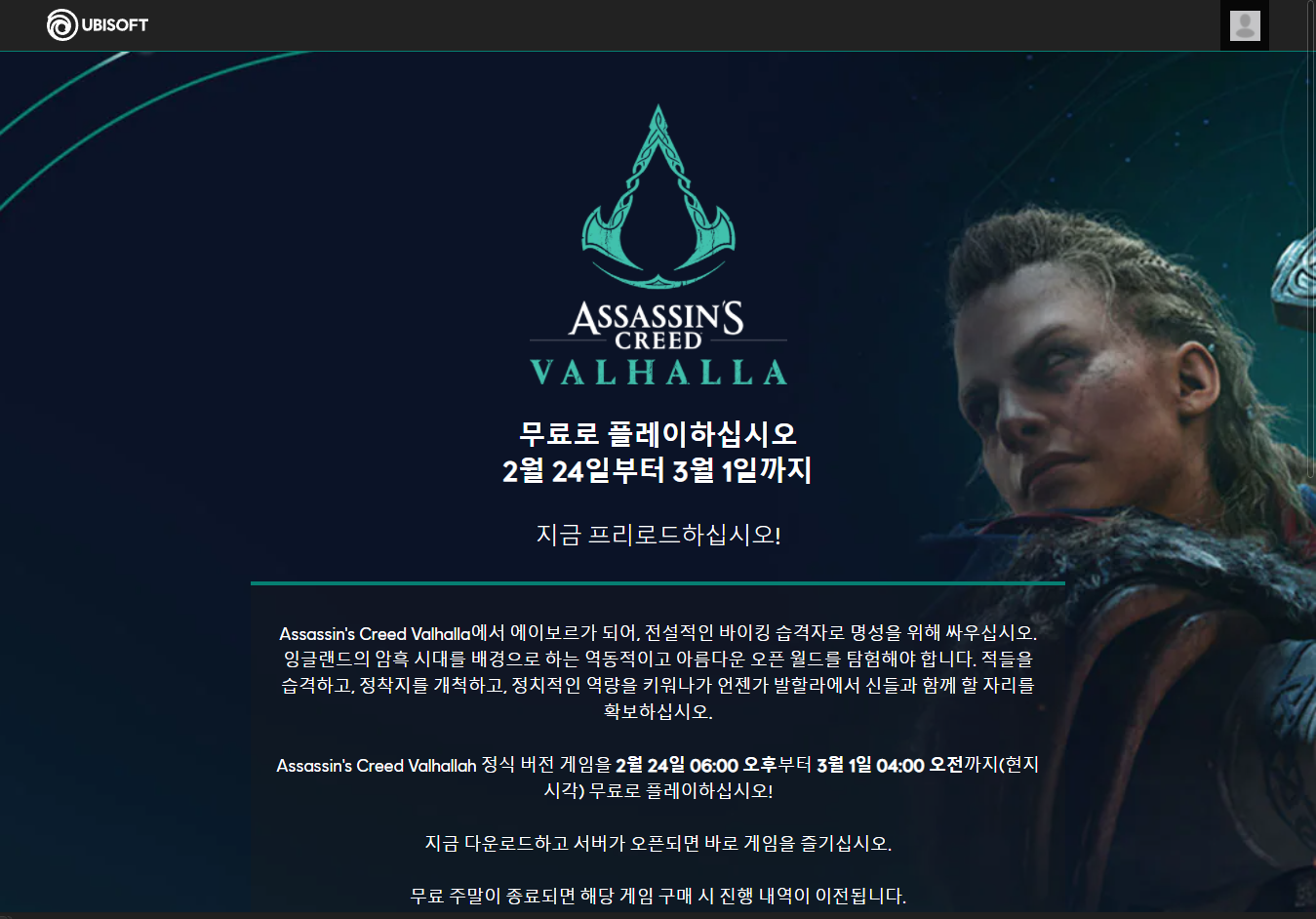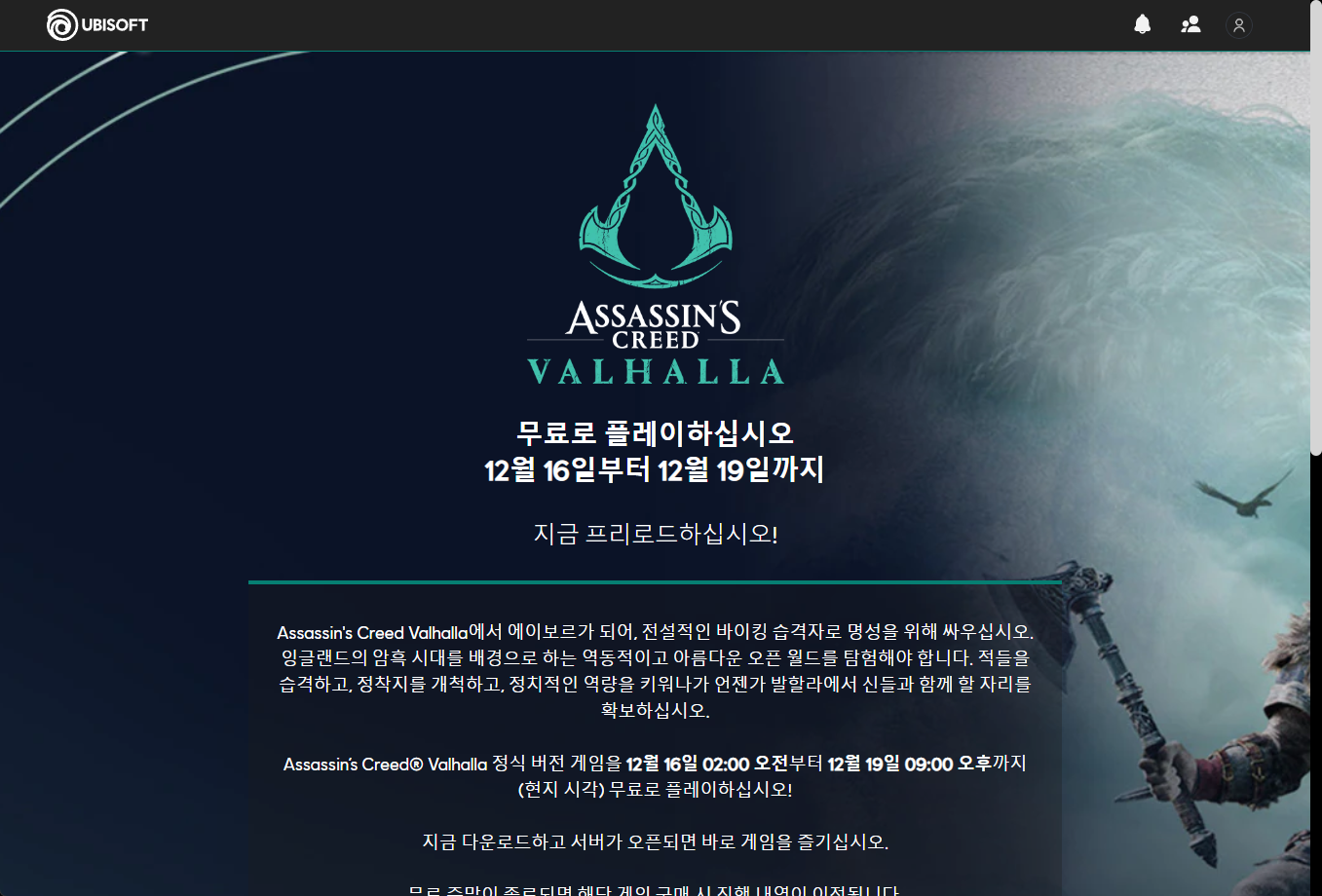 Assassin's Creed Valhalla 어쌔신 크리드: 발할라 - Ubisoft 유비소프트 금주 무료 플레이 Play for Free weekend on UbiConnect Uplay