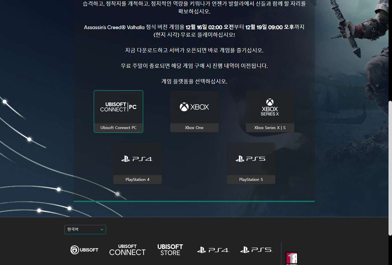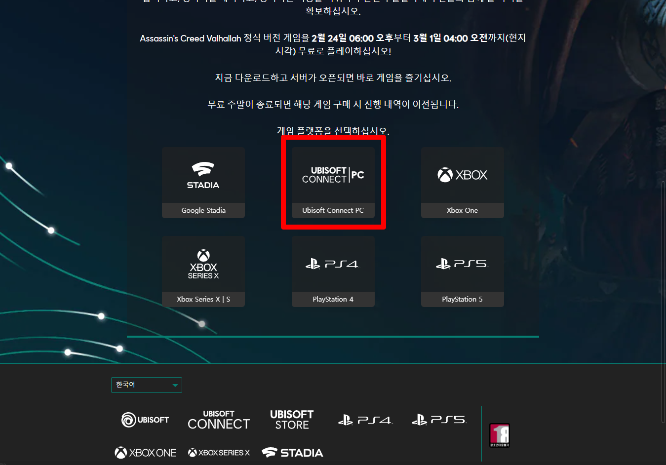 "Assassin's Creed Valhalla" 게임페이지를 조금 내려서 [UBISOFT CONNECT | PC] 버튼을 클릭하면 됩니다.