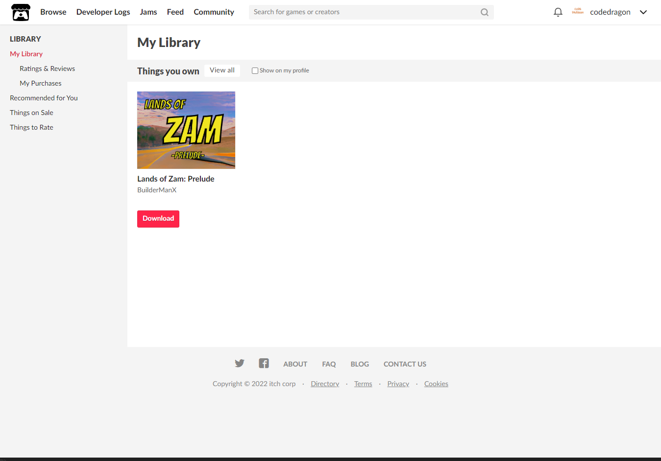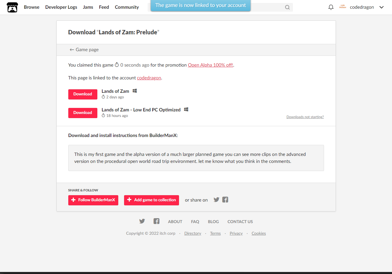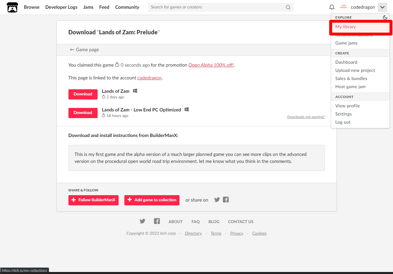 [Claim game]을 클릭하면 "Lands of Zam: Prelude" 게임이 나의 게임 라이브러리에 추가되고 설치파일을 다운받을 수 있는 페이지로 이동됩니다.