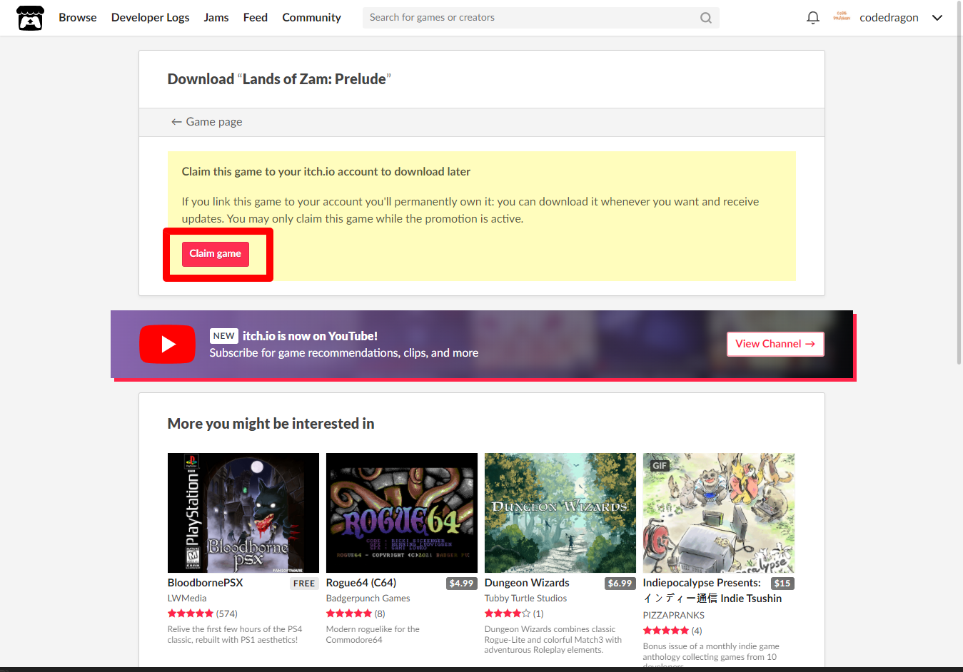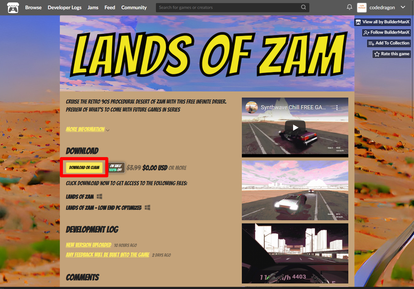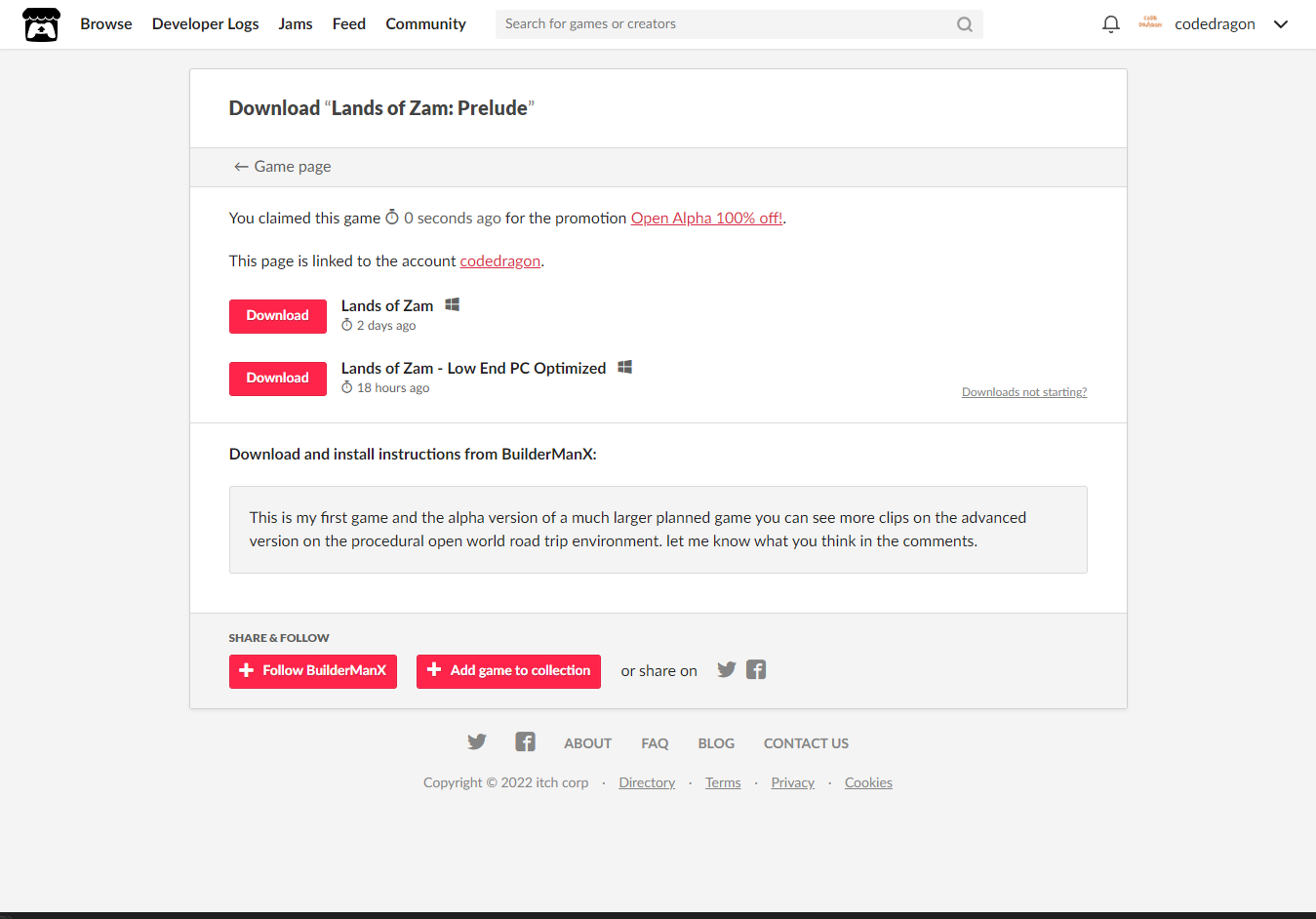 "Lands of Zam: Prelude" 페이지에 있는 [Download or claim]을 클릭합니다.