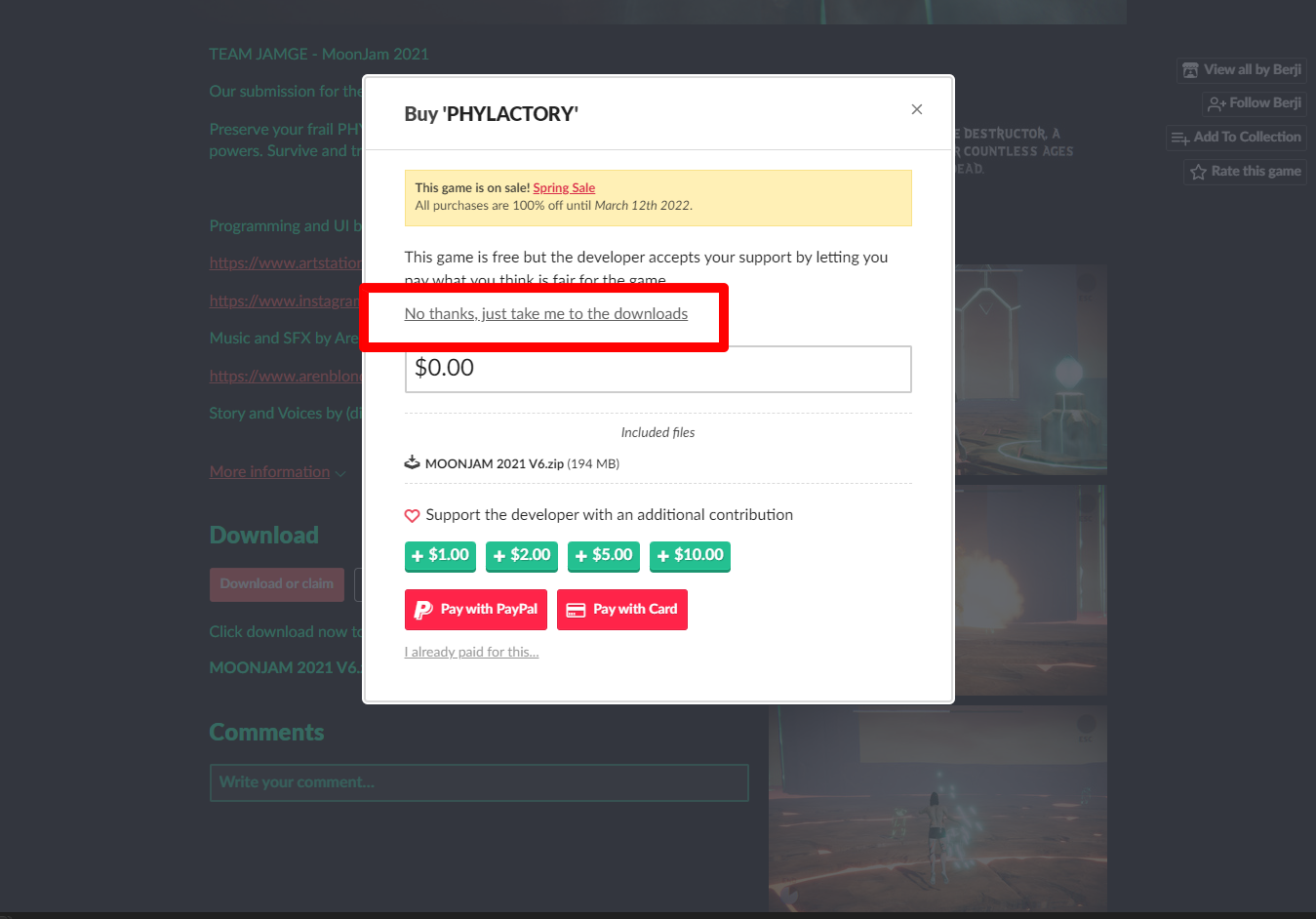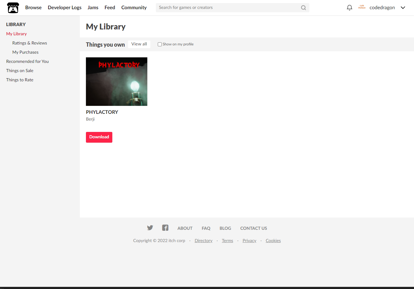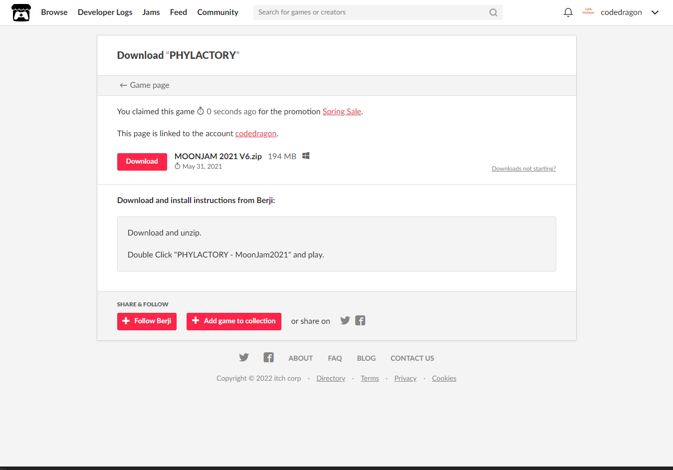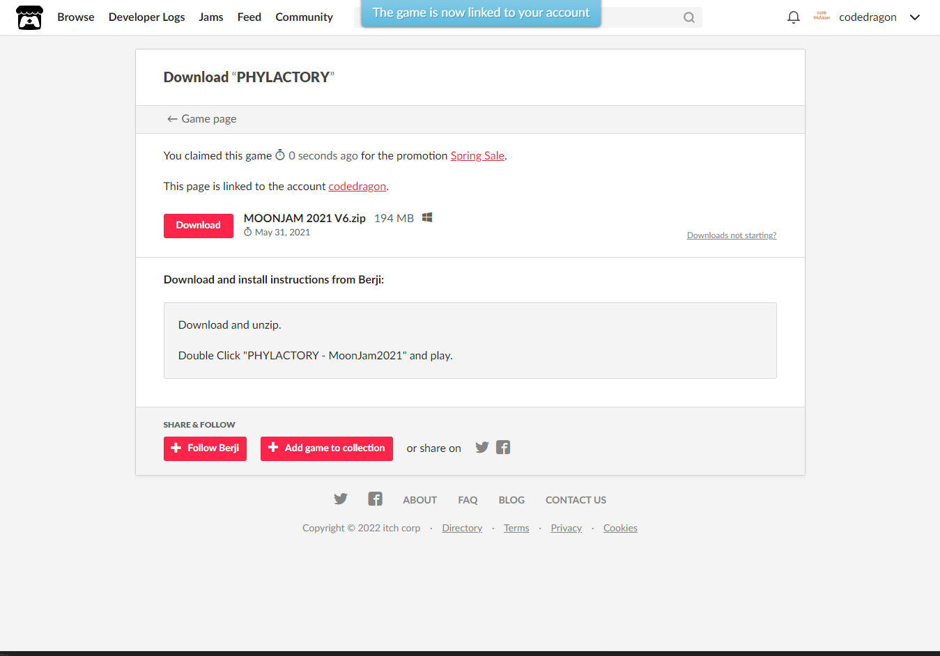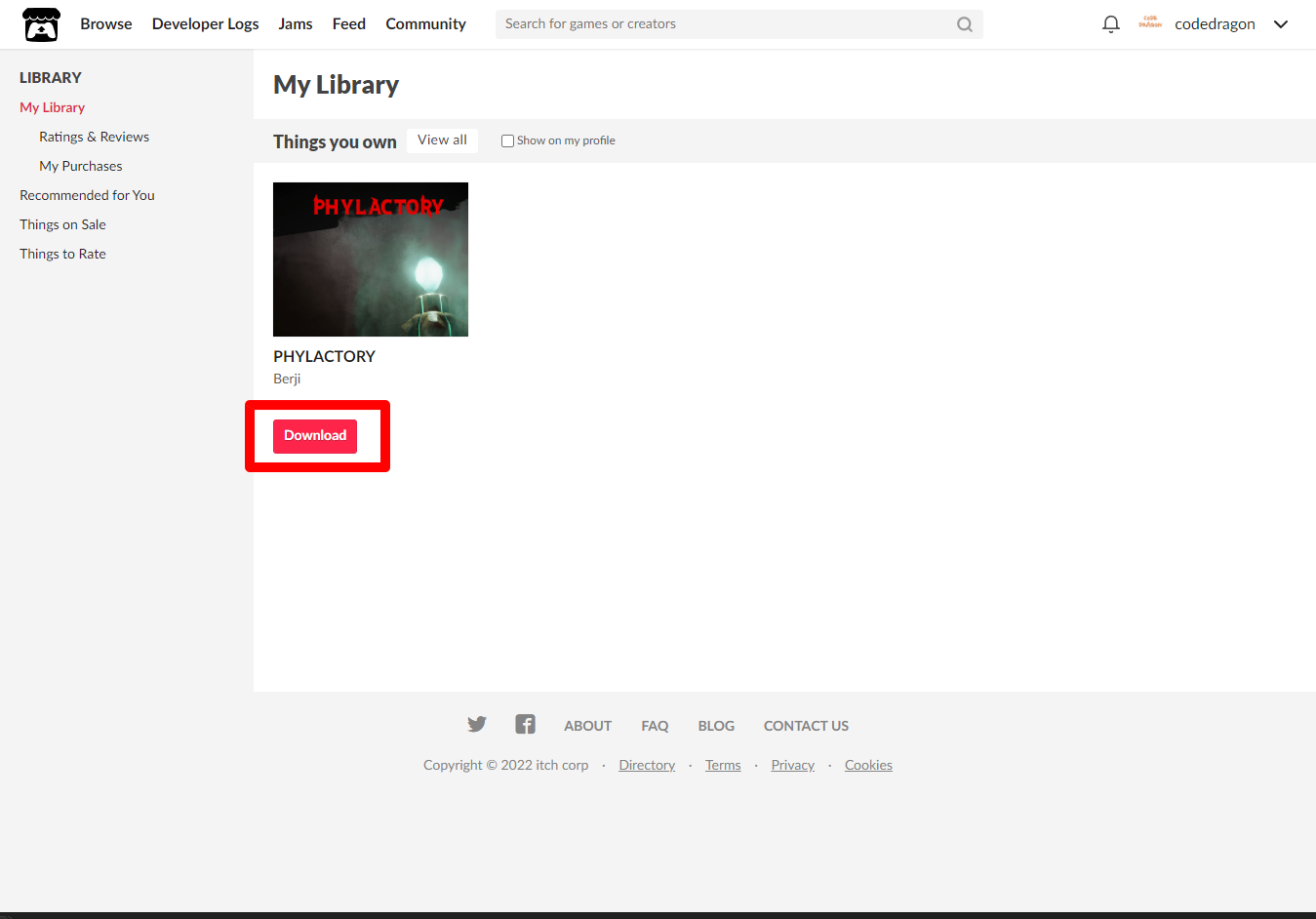 [Claim game]을 클릭하면 "PHYLACTORY" 게임이 나의 게임 라이브러리에 추가되고 설치파일을 다운받을 수 있는 페이지로 이동됩니다.