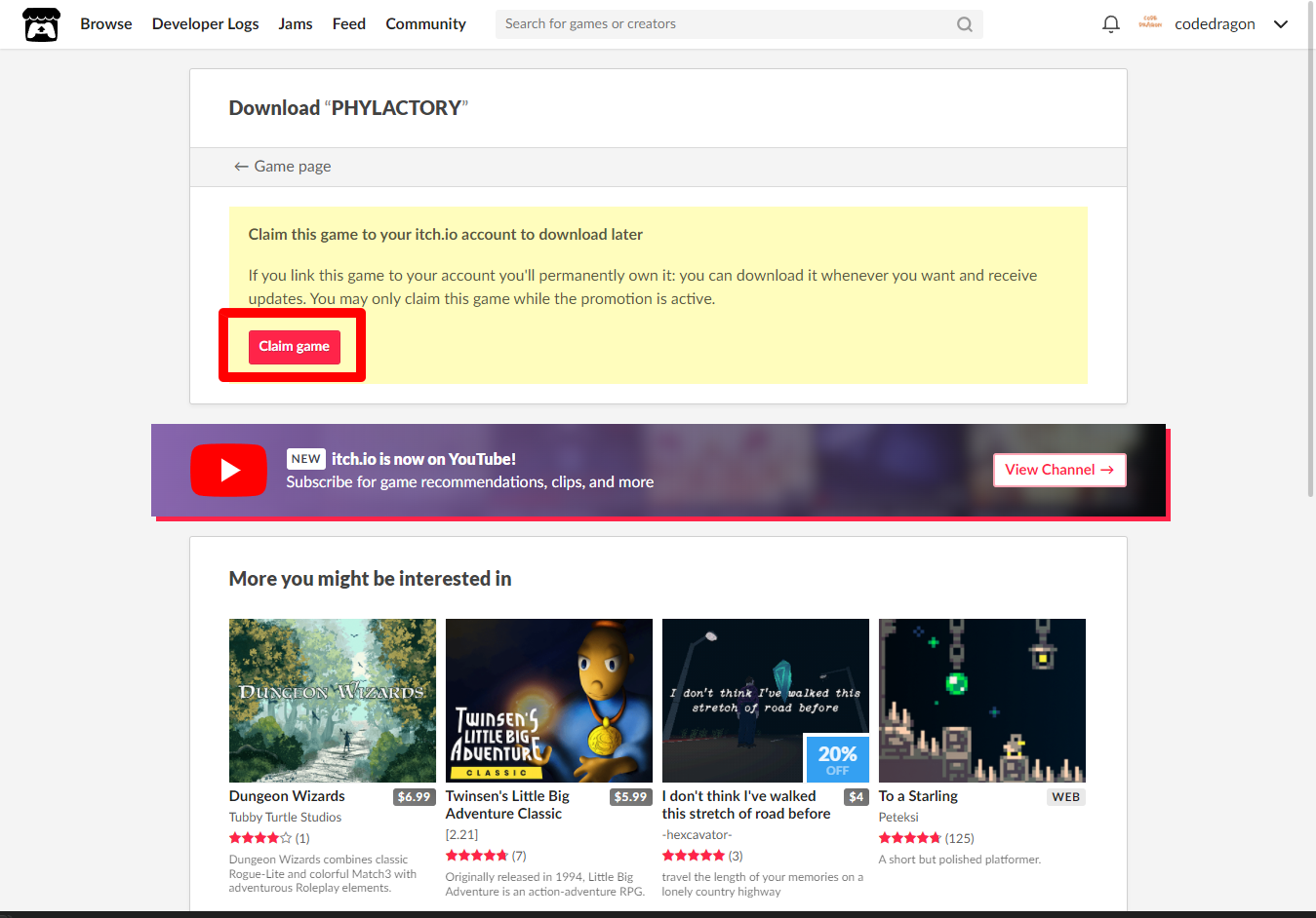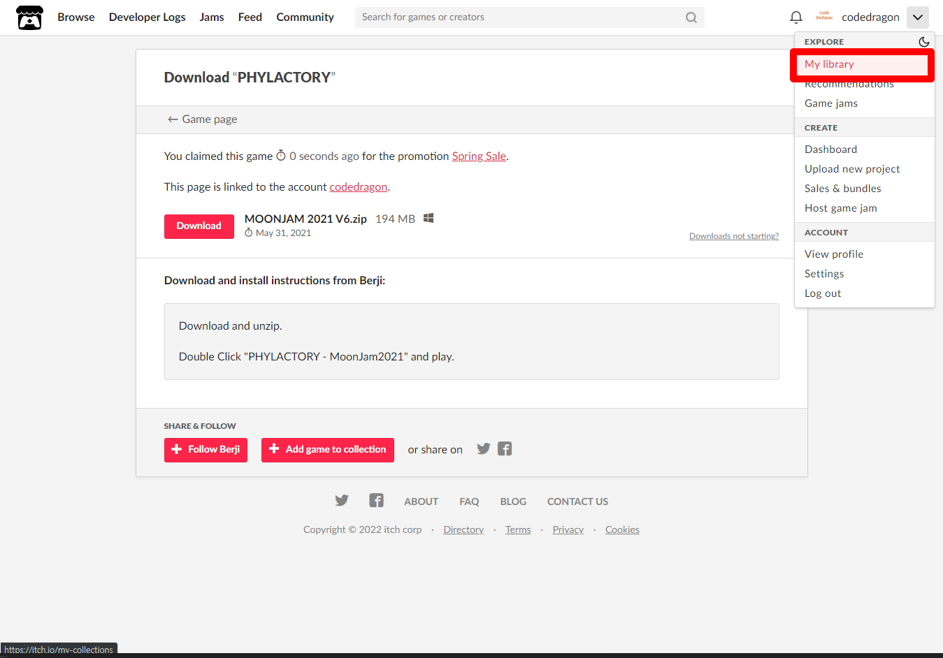[Claim game]을 클릭하면 "PHYLACTORY" 게임이 나의 게임 라이브러리에 추가되고 설치파일을 다운받을 수 있는 페이지로 이동됩니다.