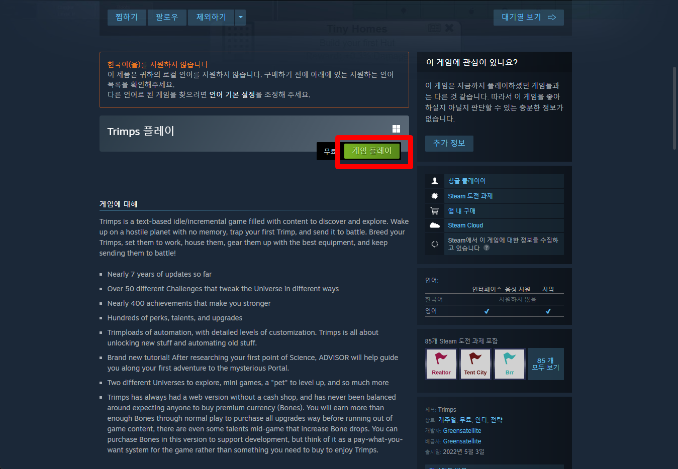 "Trimps" 페이지를 내려 [게임 플레이]를 클릭하면 됩니다.