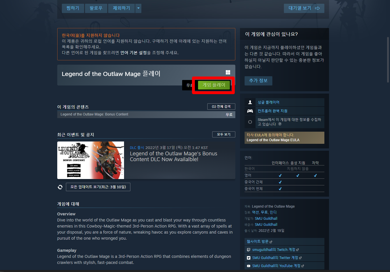 "Legend of the Outlaw Mage" 페이지를 내려 [게임 플레이]를 클릭하면 됩니다.
