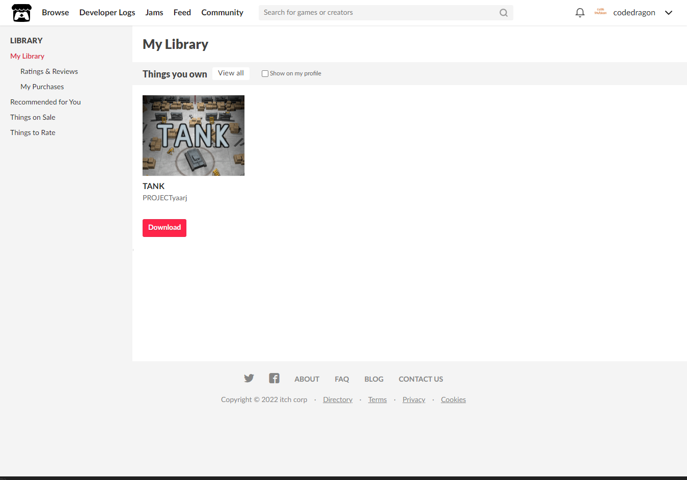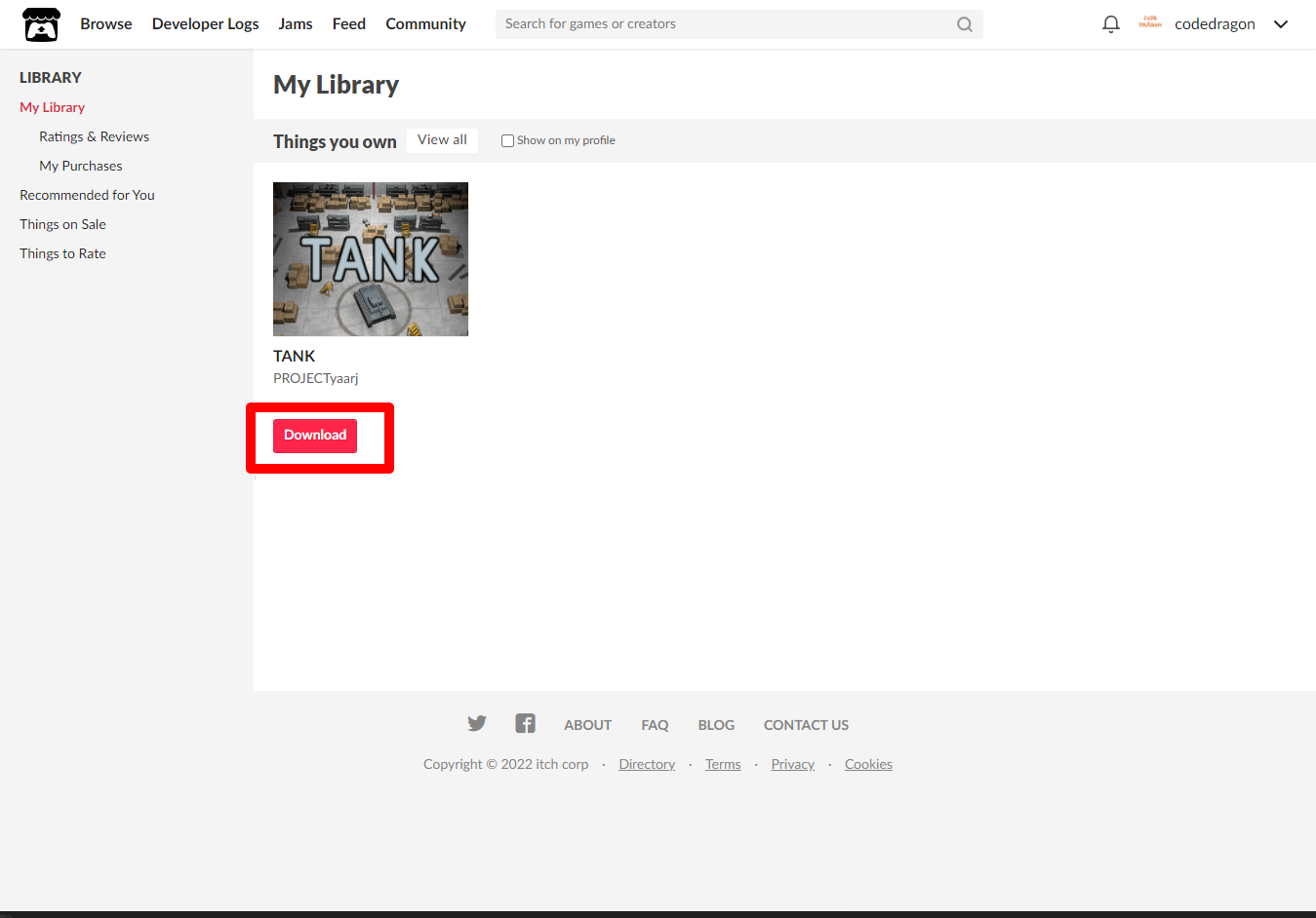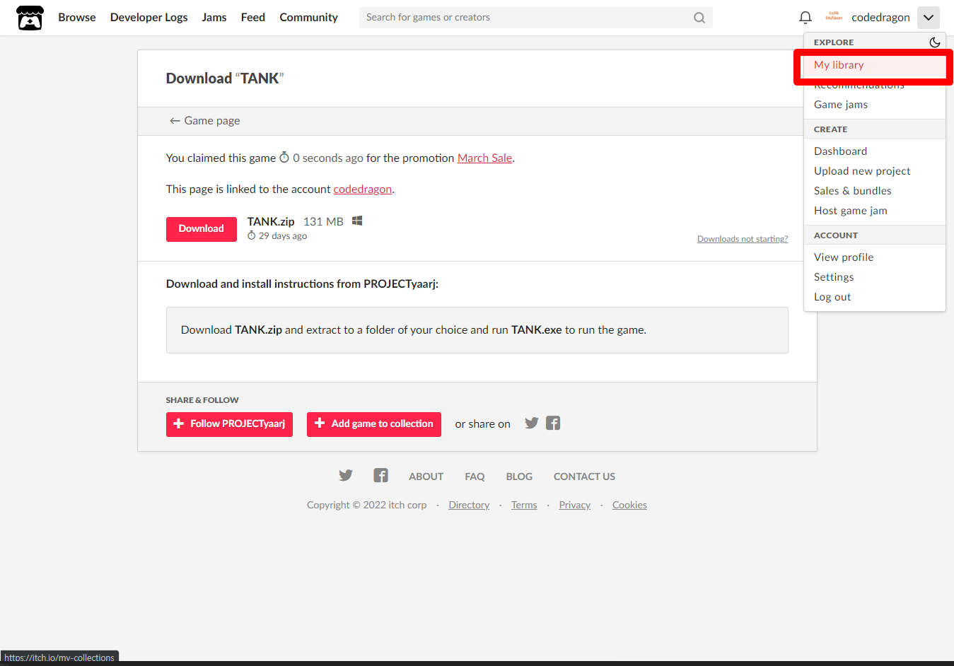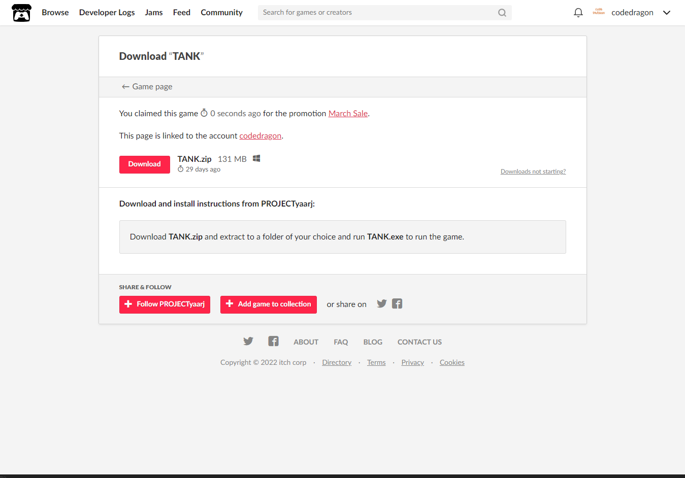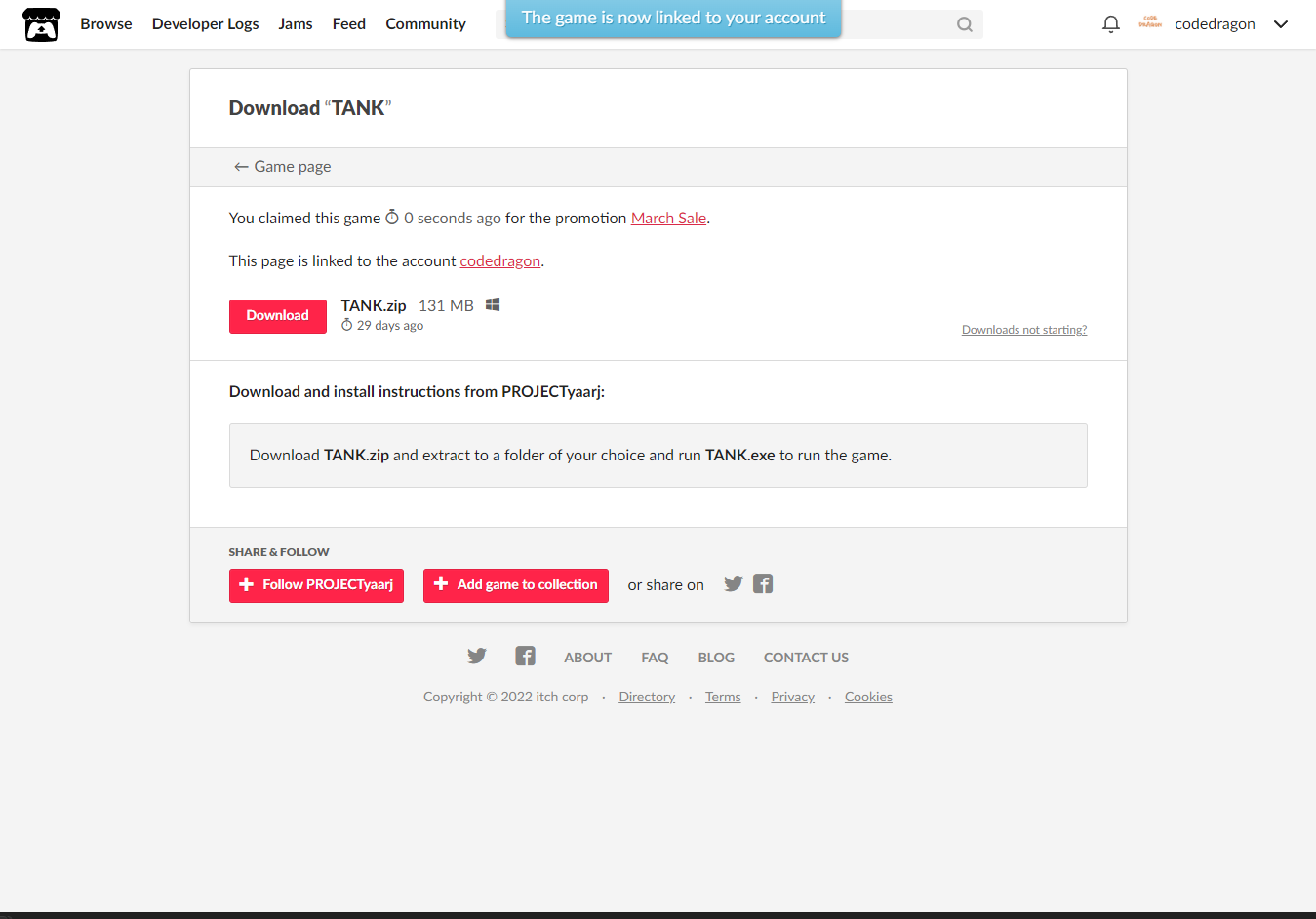 [Claim game]을 클릭하면 "TANK" 게임이 나의 게임 라이브러리에 추가되고 설치파일을 다운받을 수 있는 페이지로 이동됩니다.