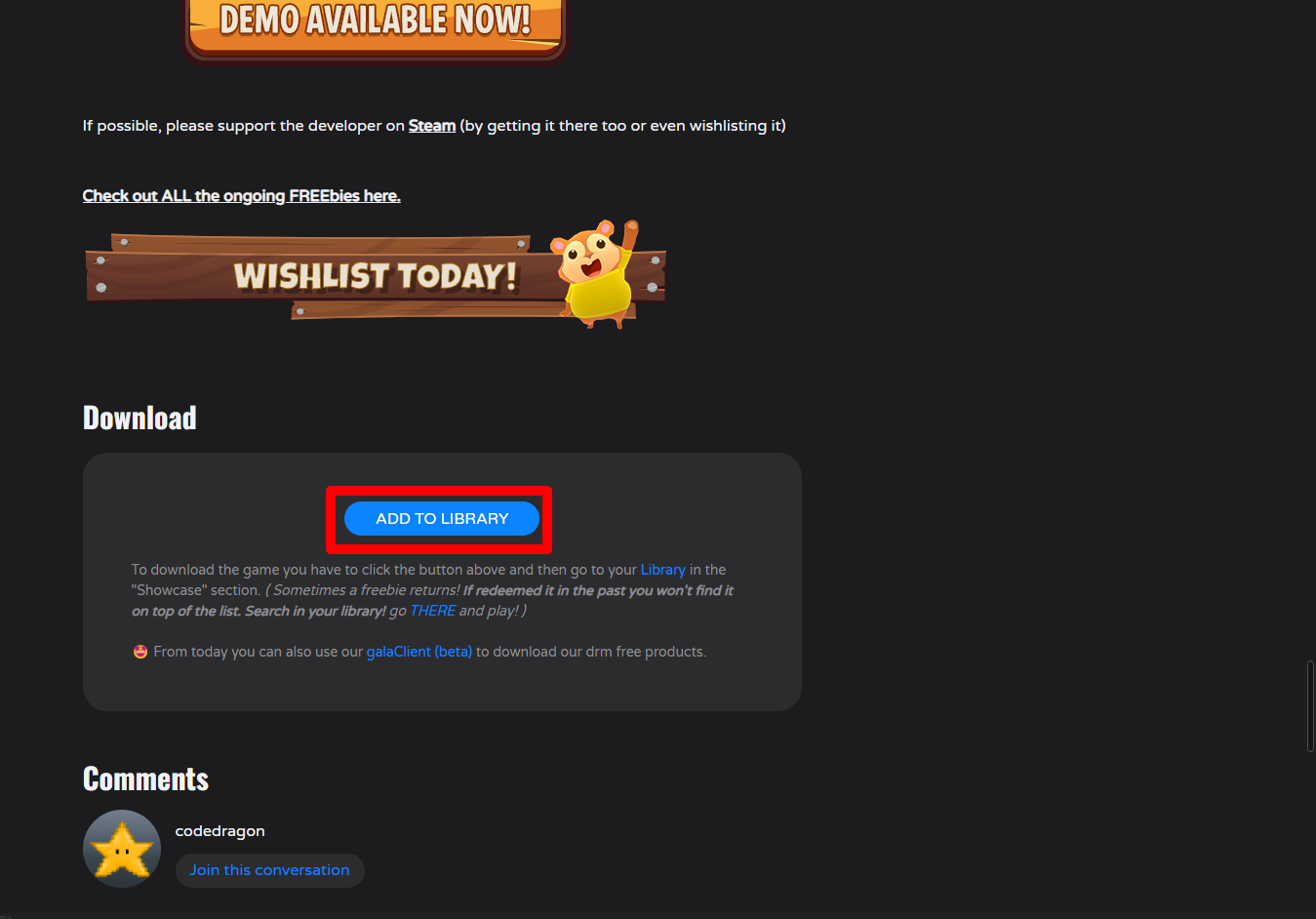 "Hamsterdam" 게임 페이지를 내려 [ADD TO LIBRARY]를 클릭합니다.