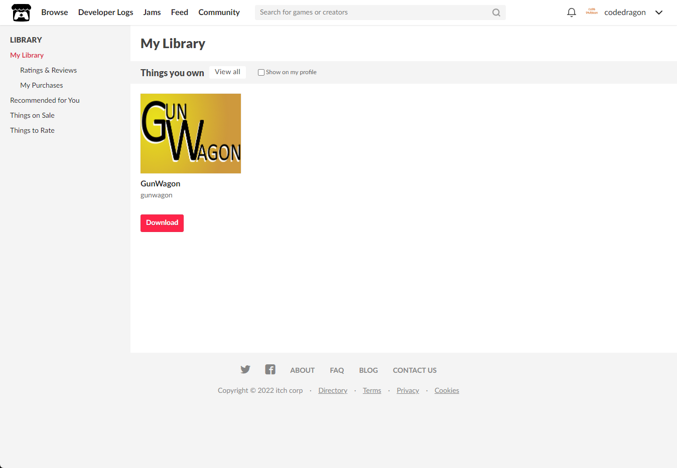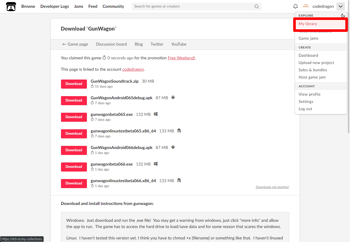 [Claim game]을 클릭하면 "GunWagon" 게임이 나의 게임 라이브러리에 추가되고 설치파일을 다운받을 수 있는 페이지로 이동됩니다.