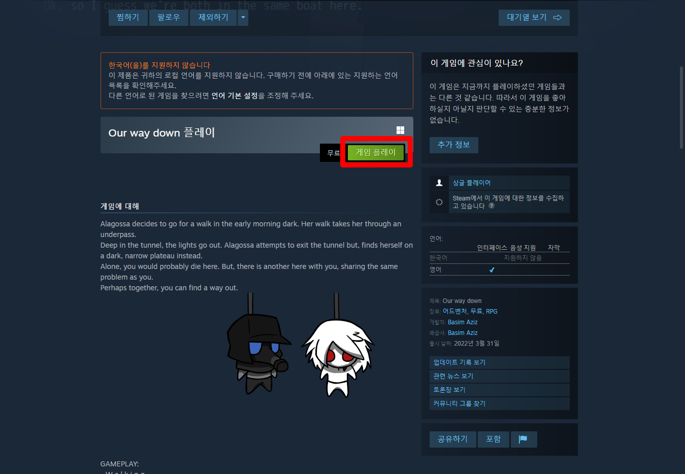 "Our way down" 페이지를 내려 [게임 플레이]를 클릭하면 됩니다.