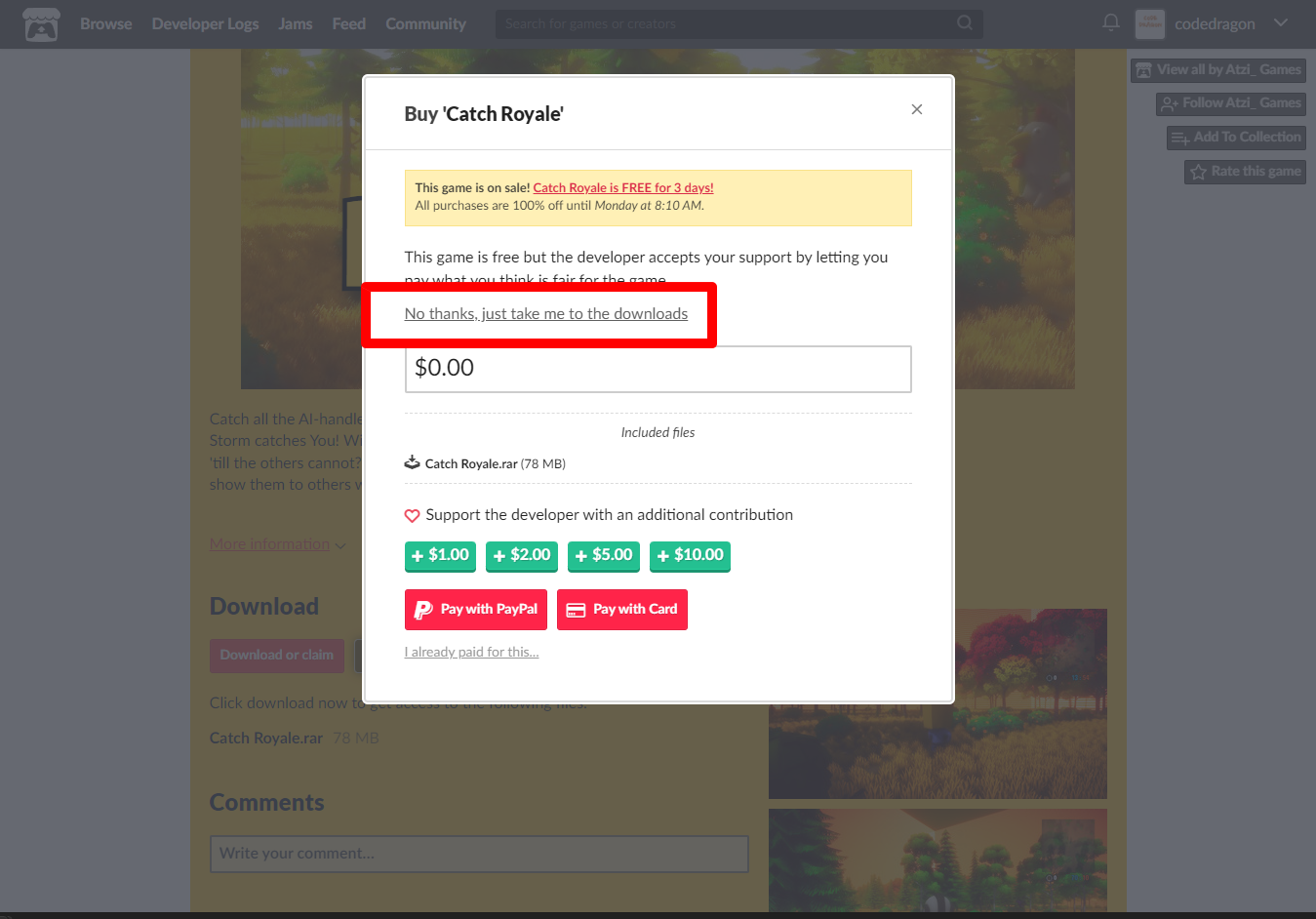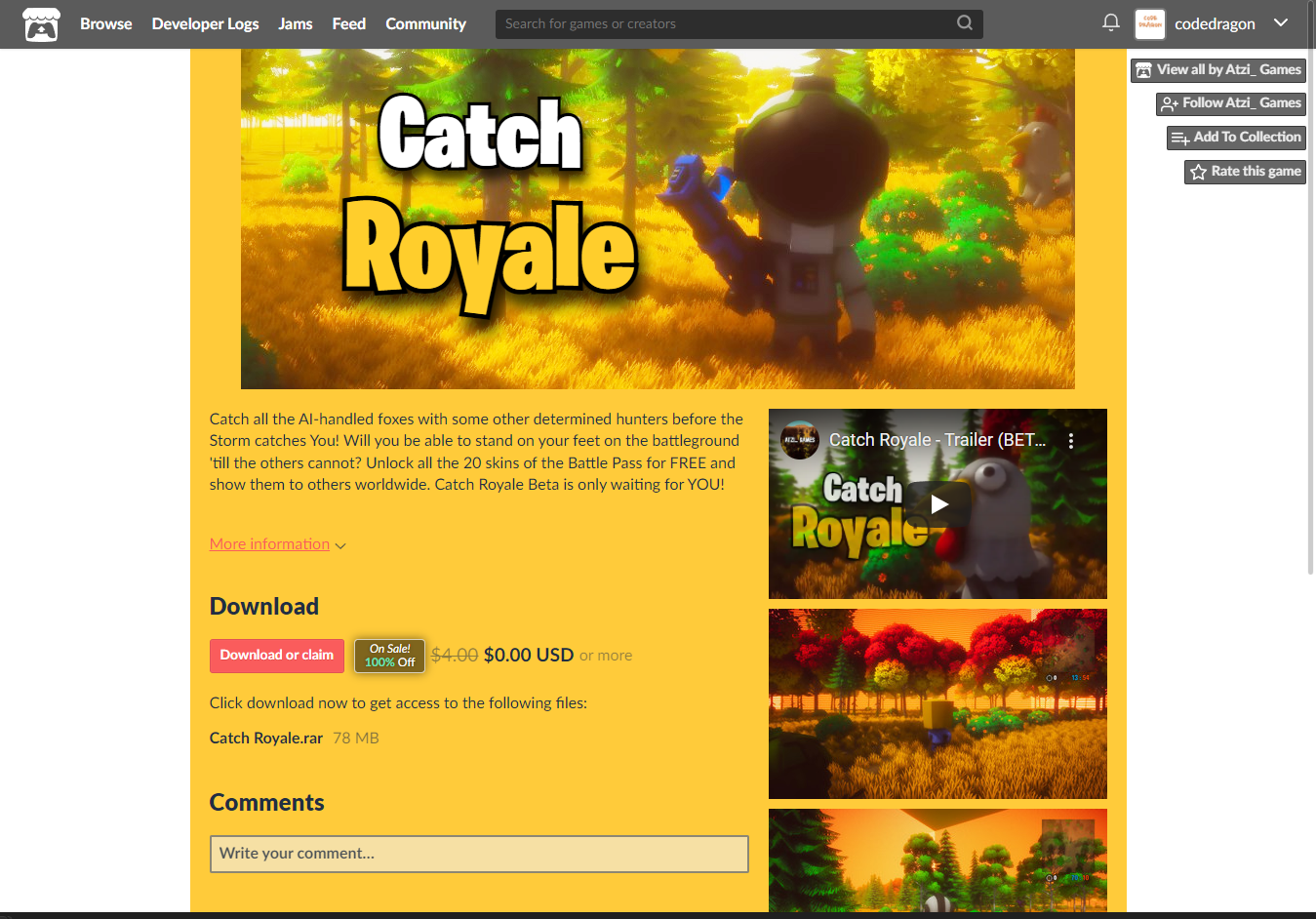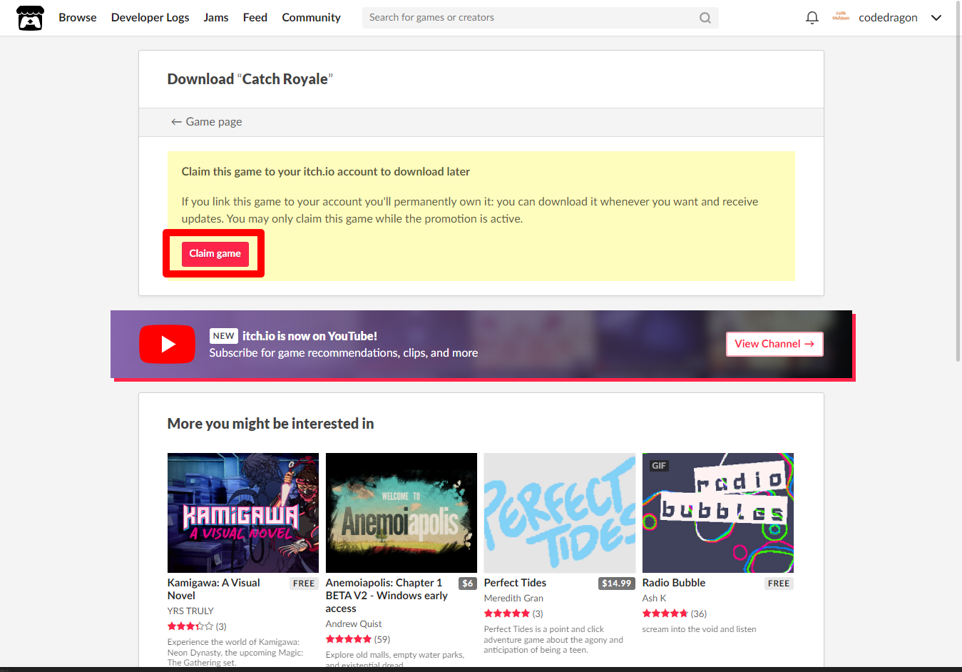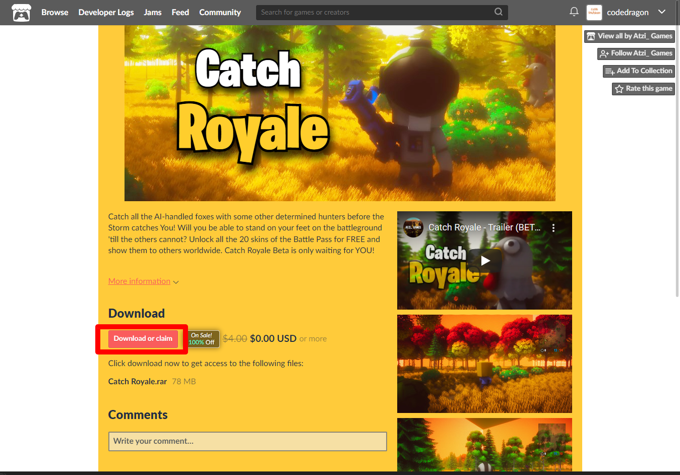 "Catch Royale" 페이지에 있는 [Download or claim]을 클릭합니다.