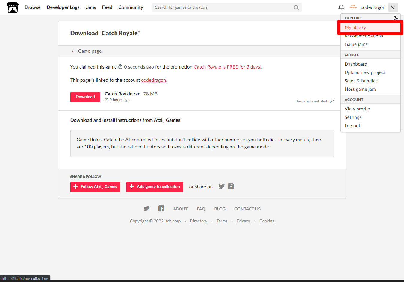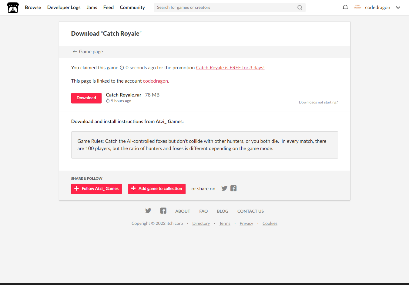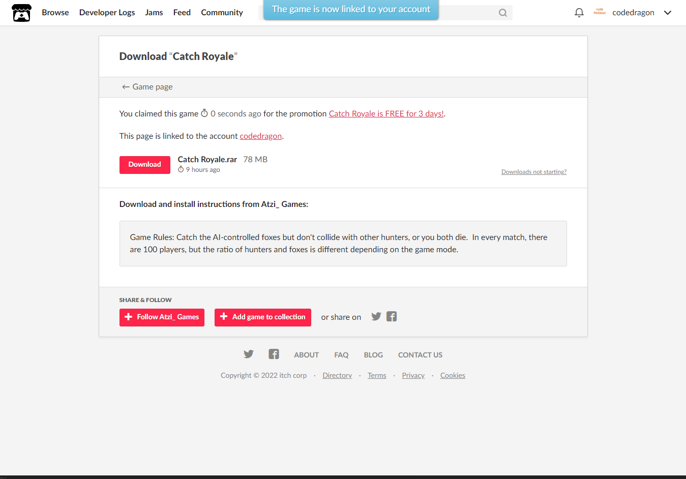 [Claim game]을 클릭하면 "Catch Royale" 게임이 나의 게임 라이브러리에 추가되고 설치파일을 다운받을 수 있는 페이지로 이동됩니다.