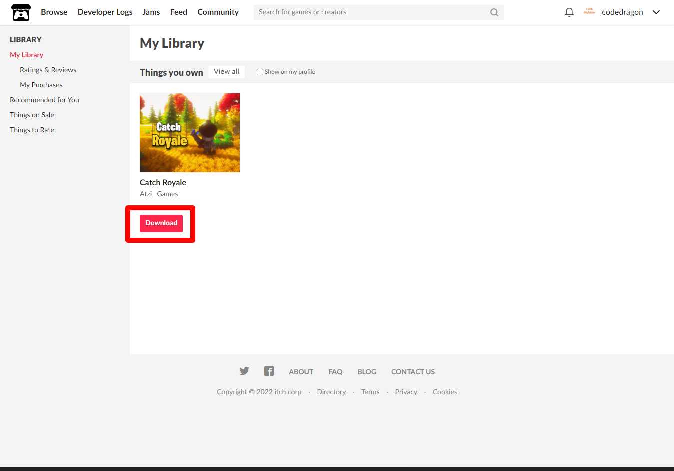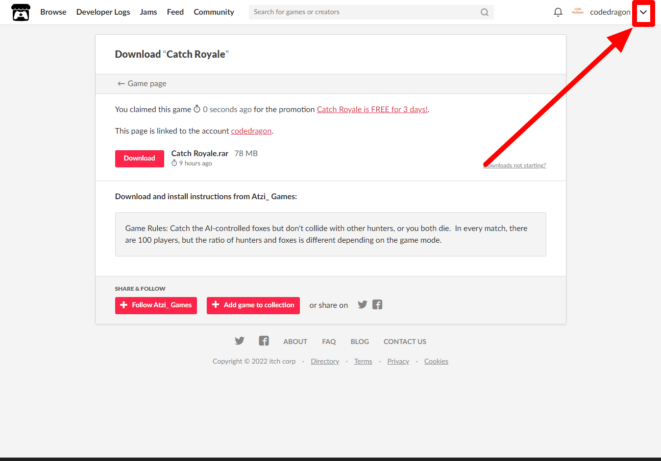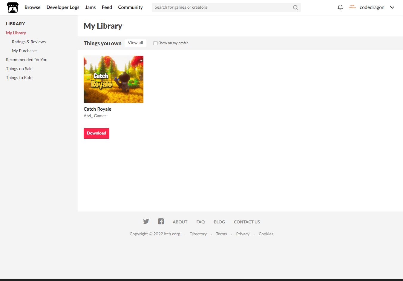 [Claim game]을 클릭하면 "Catch Royale" 게임이 나의 게임 라이브러리에 추가되고 설치파일을 다운받을 수 있는 페이지로 이동됩니다.