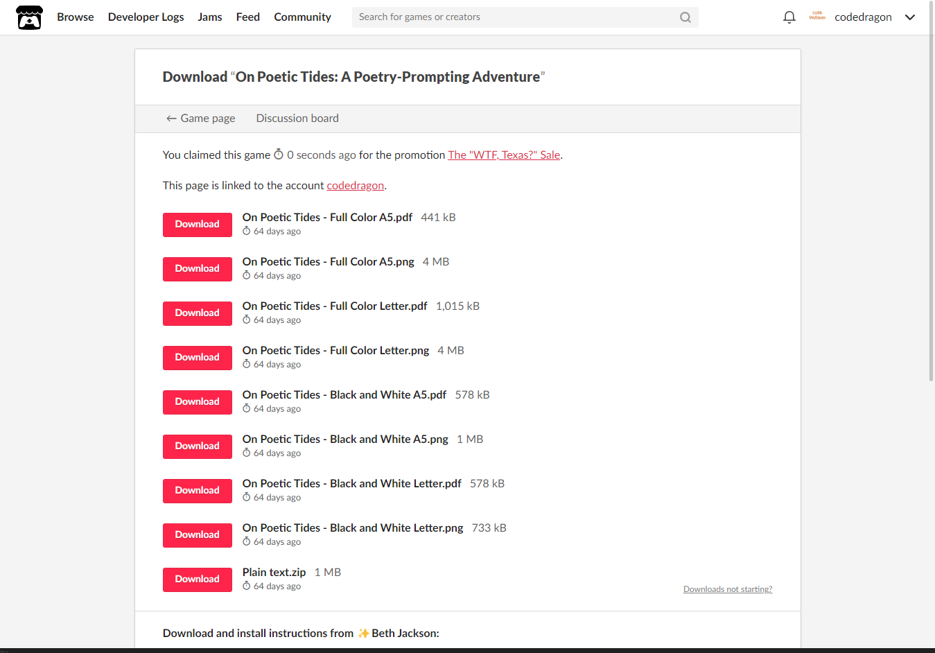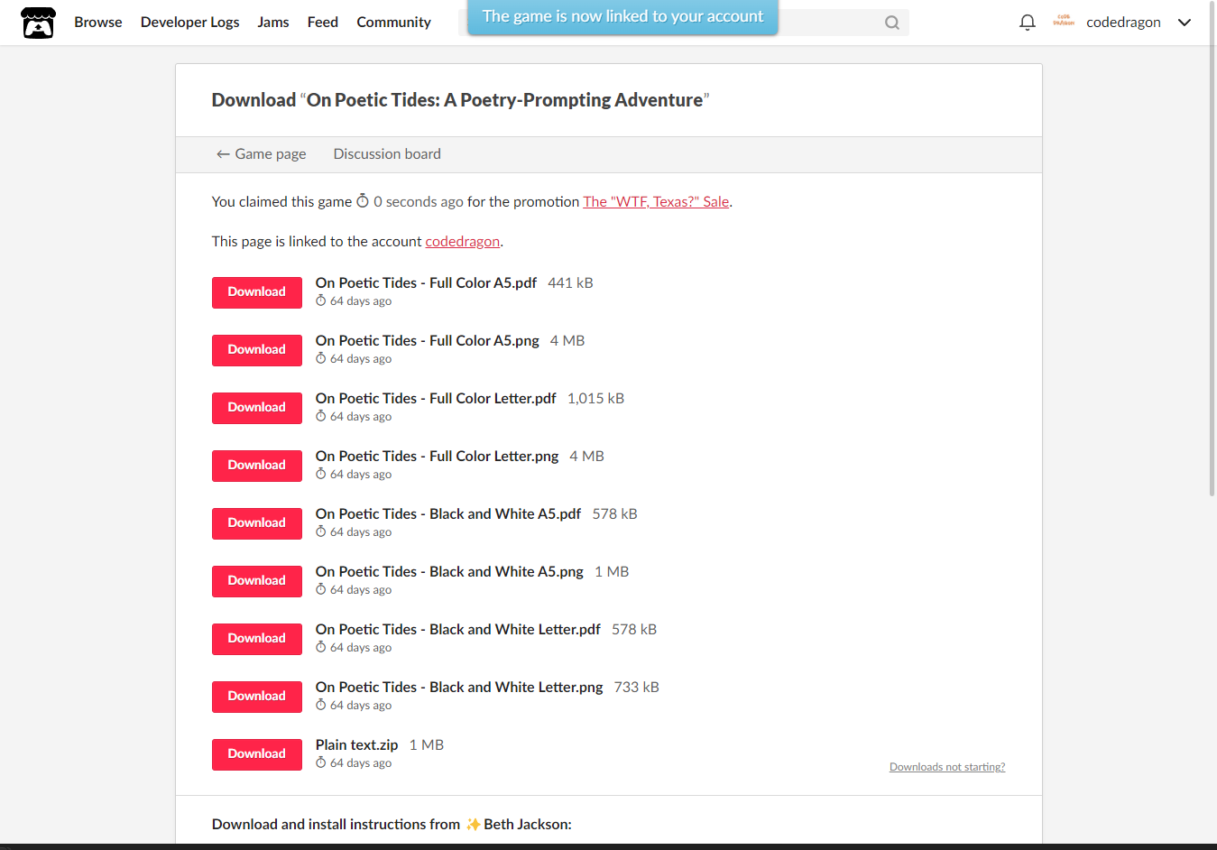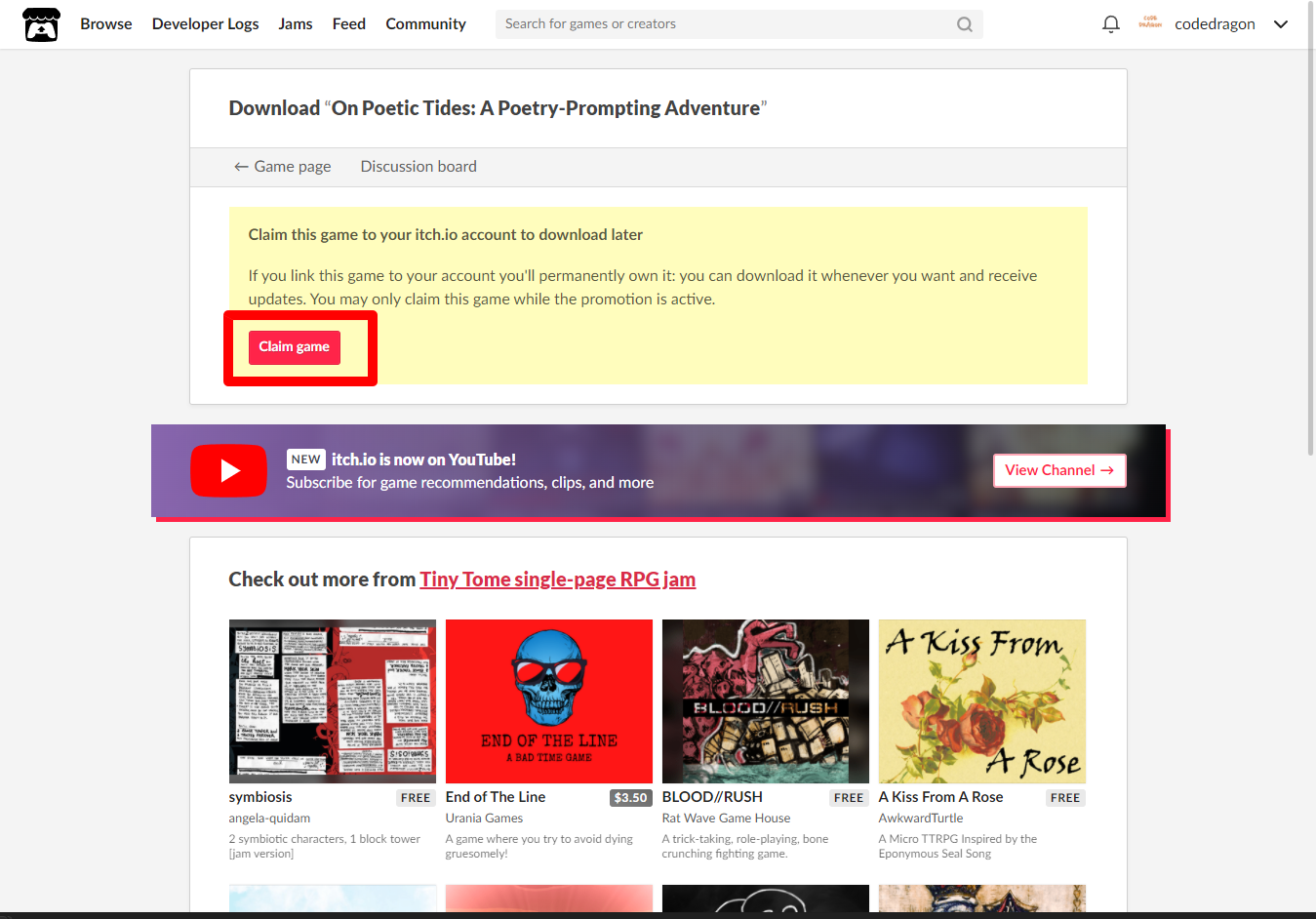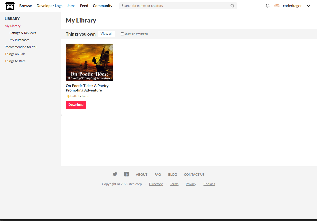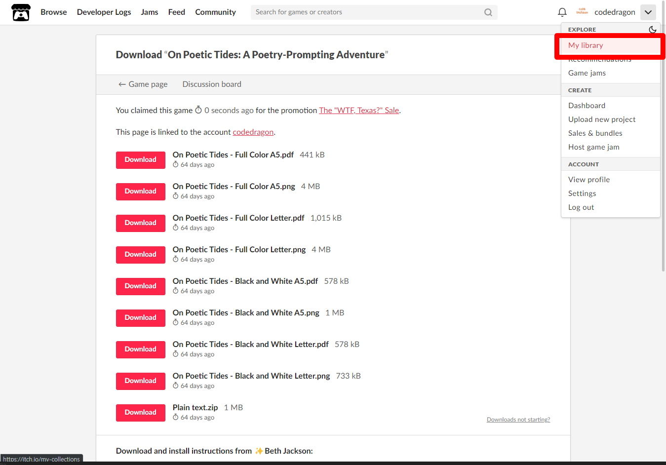 [Claim game]을 클릭하면 "On Poetic Tides: A Poetry-Prompting Adventure" 게임이 나의 게임 라이브러리에 추가되고 설치파일을 다운받을 수 있는 페이지로 이동됩니다.