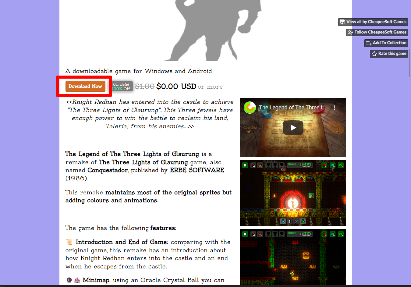 "The Legend of The Three Lights of Glaurung" 해당 항목에 있는 [Download] 버튼을 클릭하면 게임의 설치파일을 다운받을 수 있습니다.
