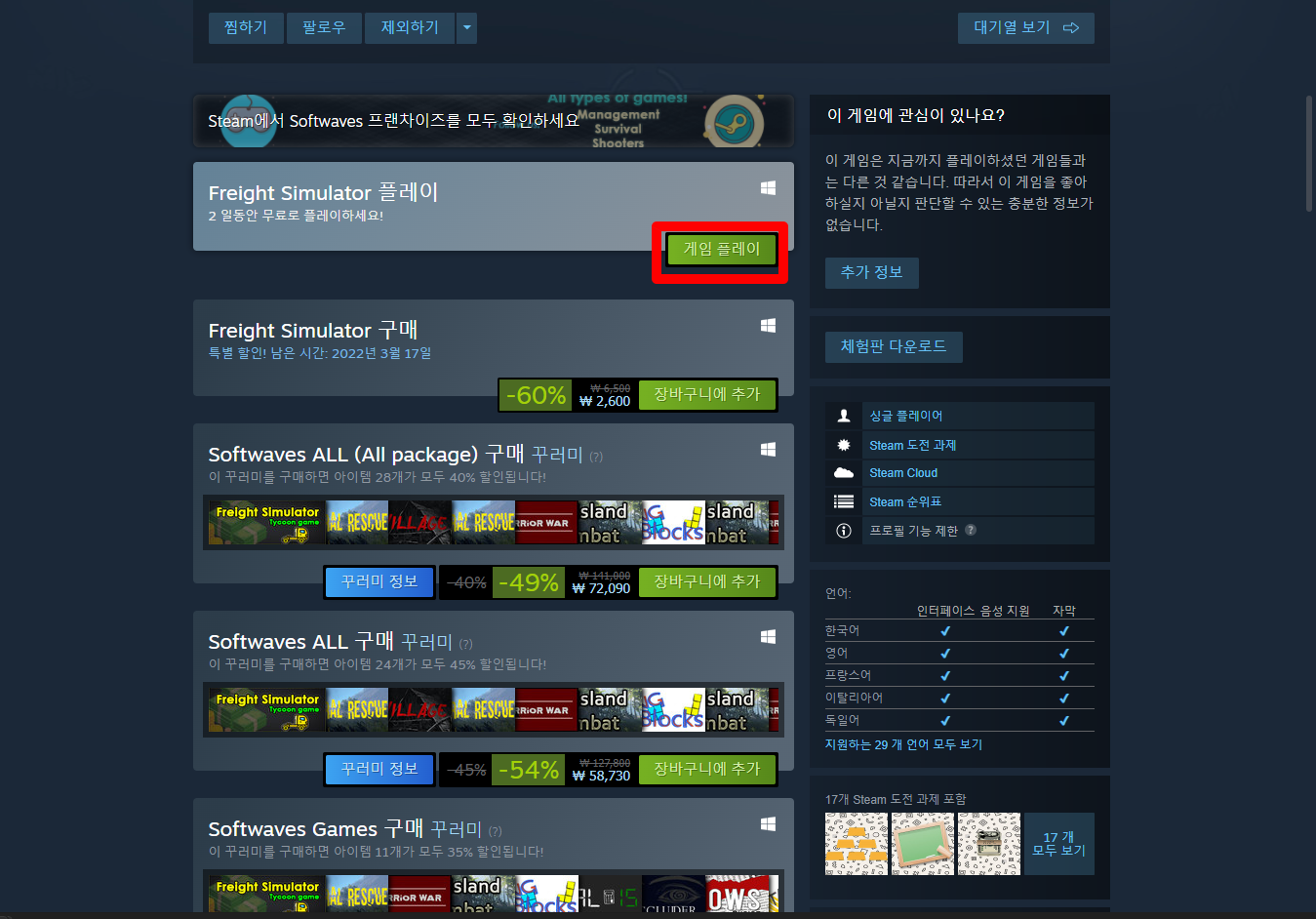 "Freight Simulator" 게임페이지를 조금 내려서 [게임 플레이] 버튼을 클릭하면 됩니다.