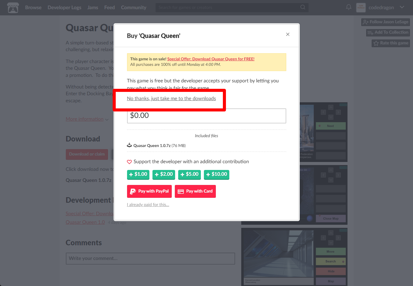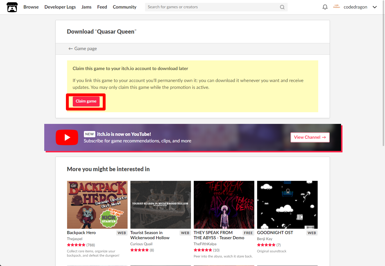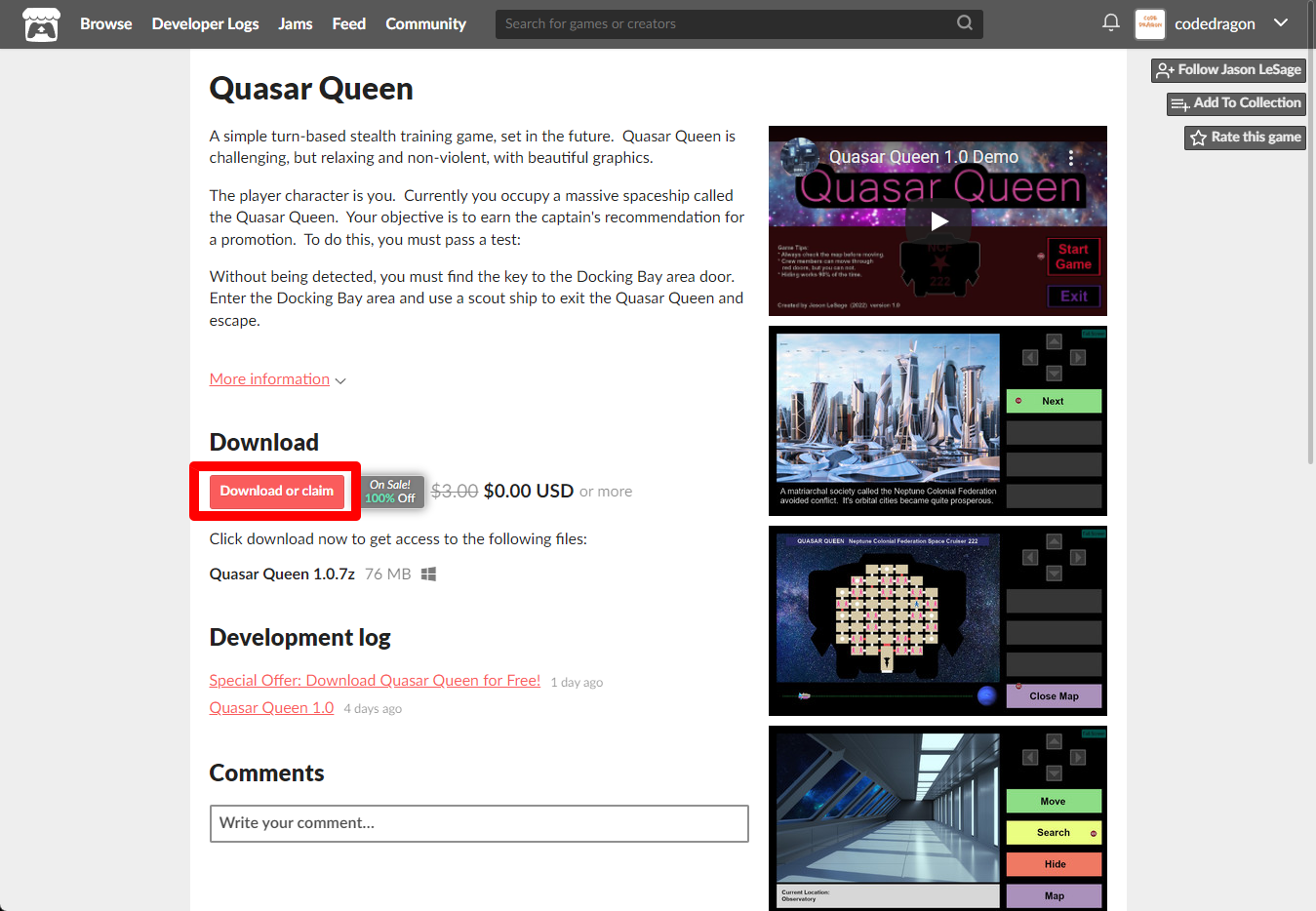 "Quasar Queen" 페이지에 있는 [Download or claim]을 클릭합니다.