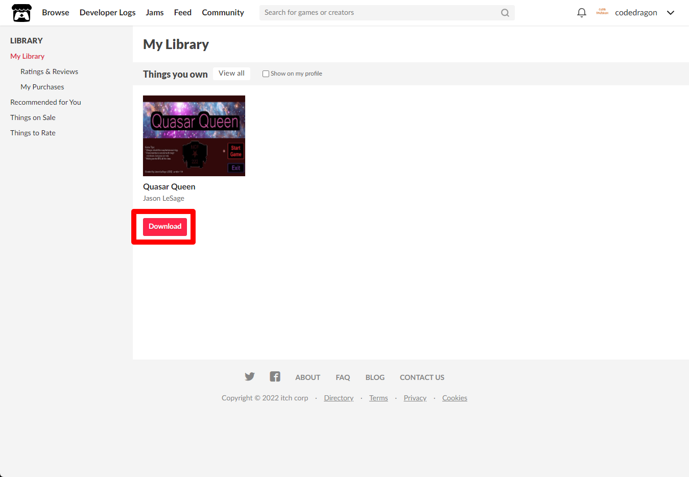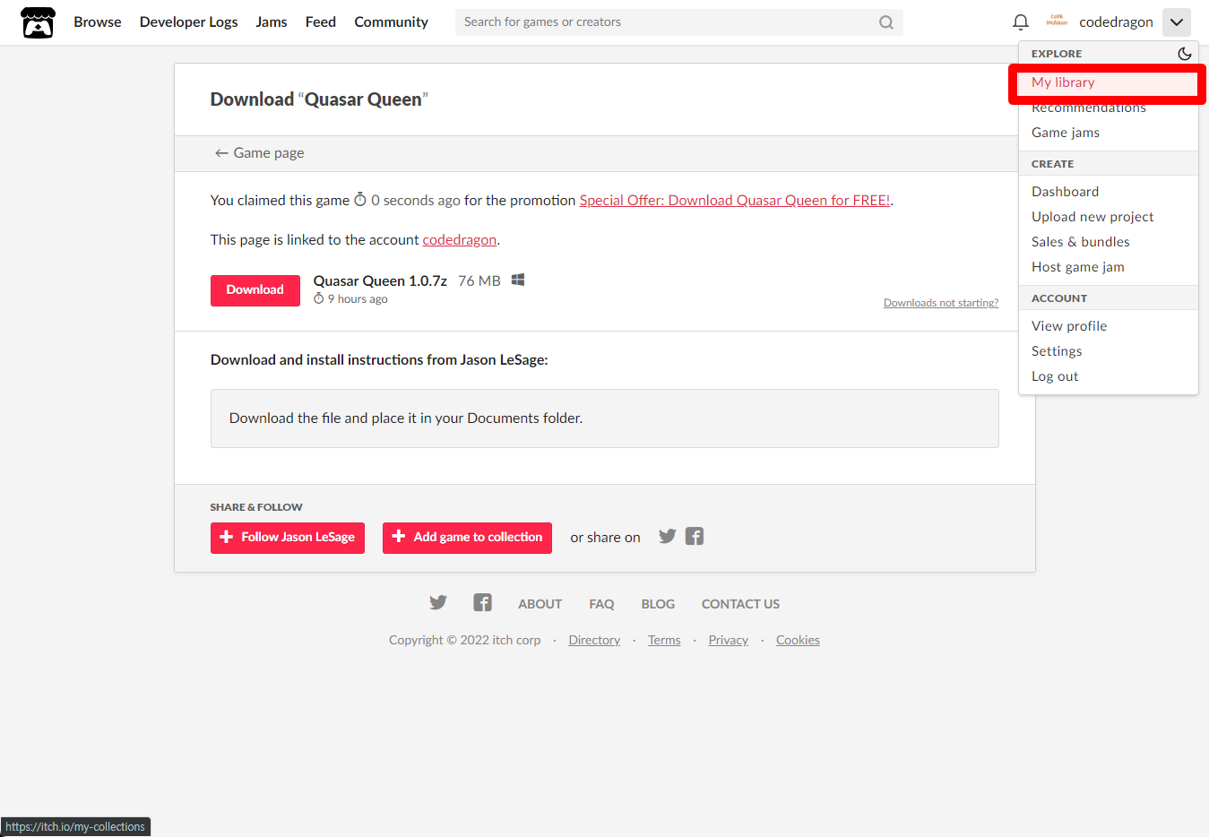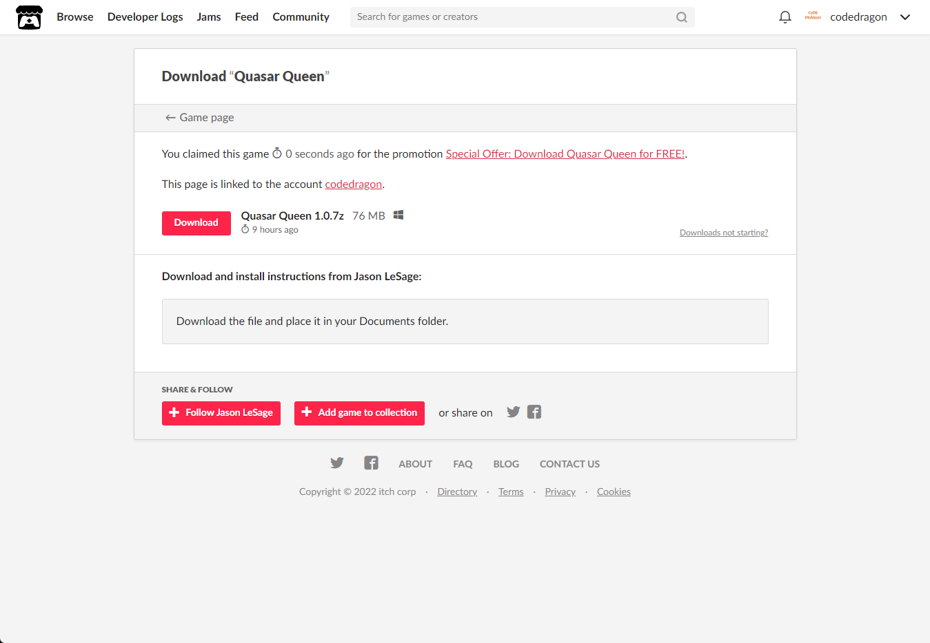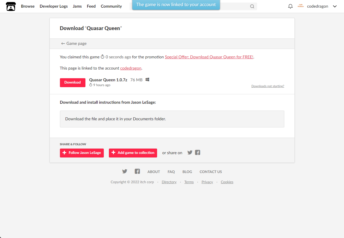 [Claim game]을 클릭하면 "Quasar Queen" 게임이 나의 게임 라이브러리에 추가되고 설치파일을 다운받을 수 있는 페이지로 이동됩니다.