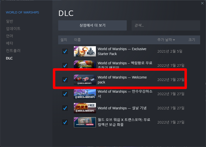 DLC관리창에서 방금 받은 "World of Warships — Welcome Pack" DLC 항목을 확인할 수 있습니다.