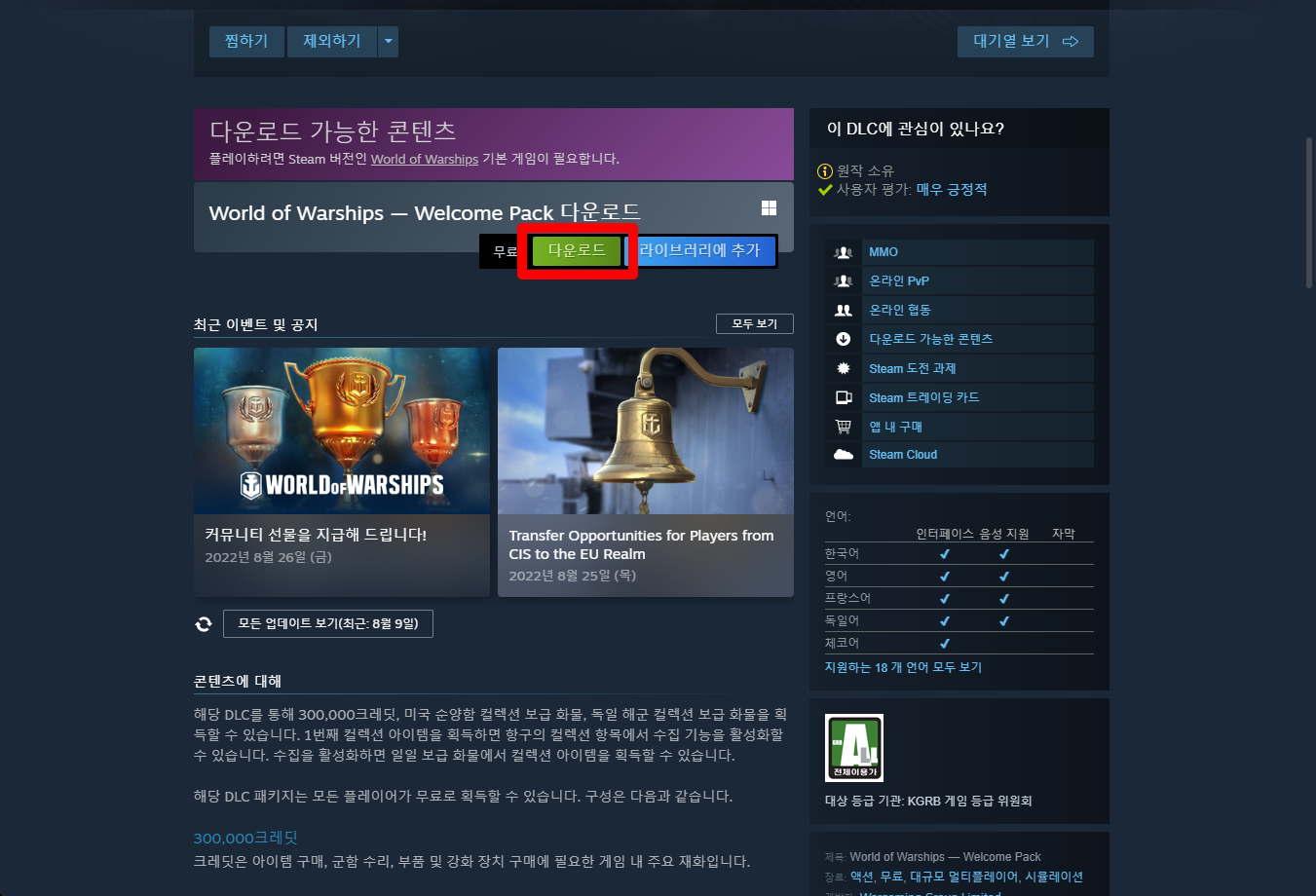 "World of Warships — Welcome Pack" 게임페이지를 조금 내려준 후 [다운로드] 버튼을 클릭해서 스팀런처 실행하면 게임라이브러리에 추가됩니다.