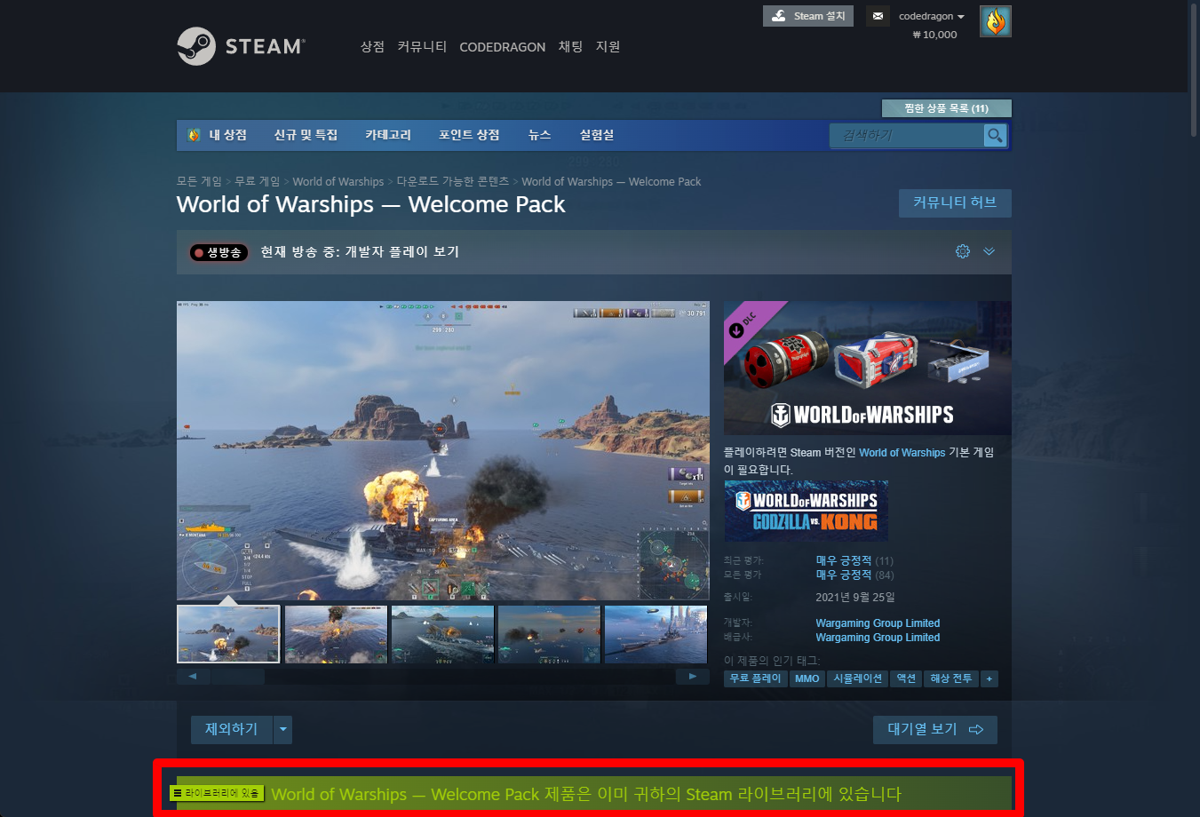 다시 "World of Warships — Welcome Pack" 게임페이지로 돌아와 보면 녹색으로 게임라이브러리에 추가되었음을 확인할 수 있습니다.