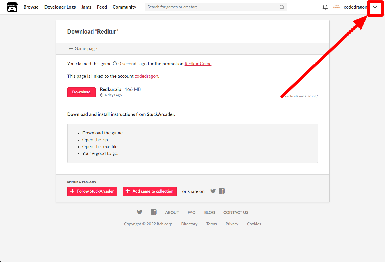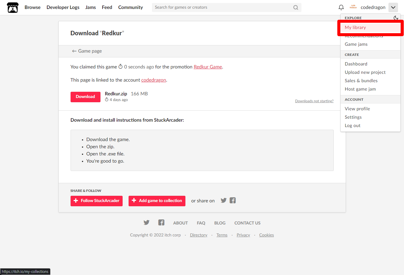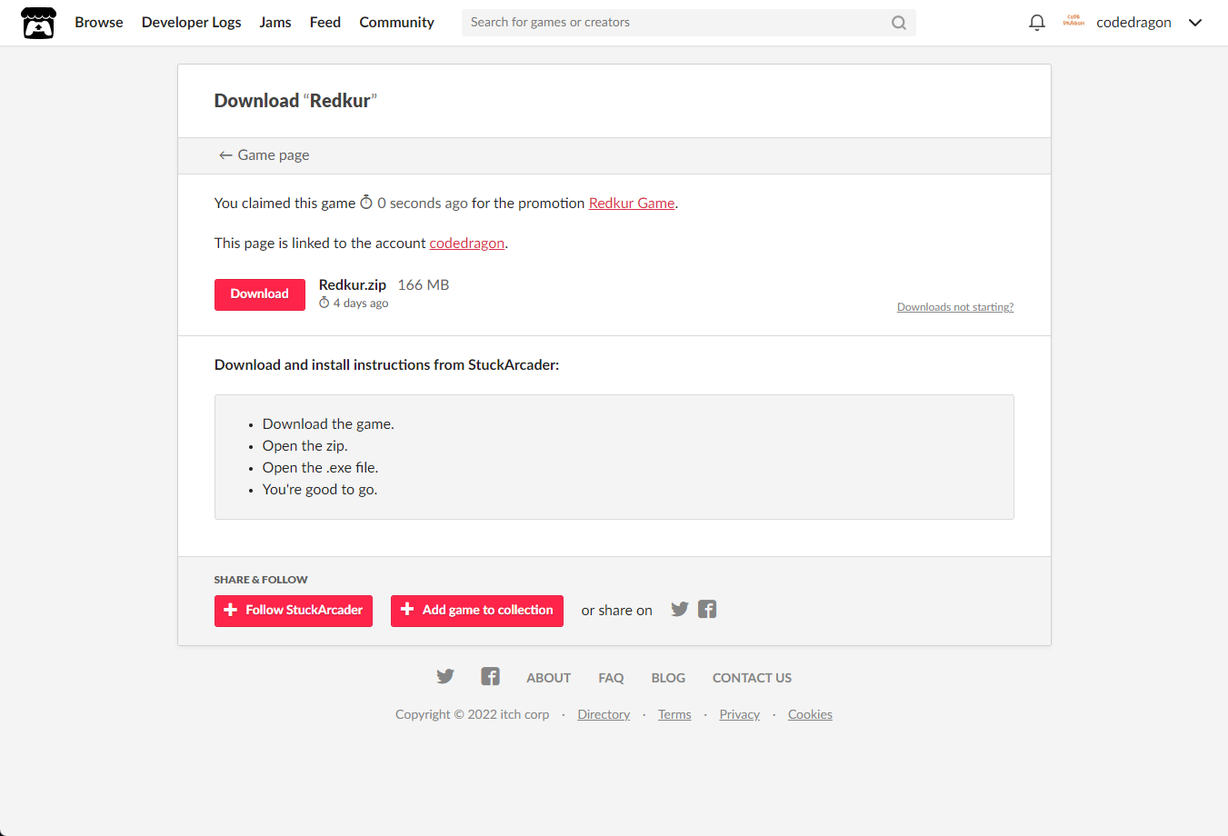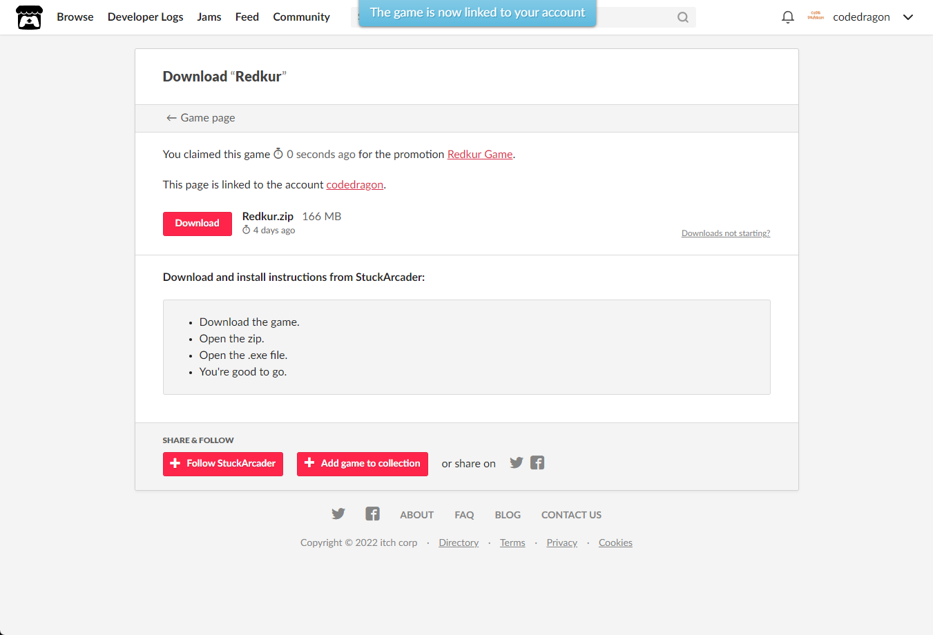 [Claim game]을 클릭하면 "Redkur" 게임이 나의 게임 라이브러리에 추가되고 설치파일을 다운받을 수 있는 페이지로 이동됩니다.