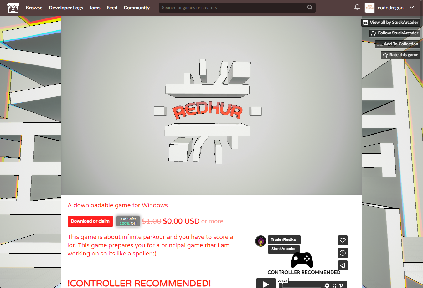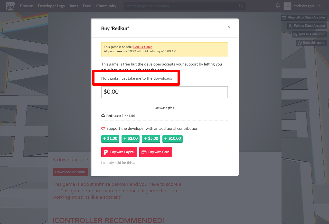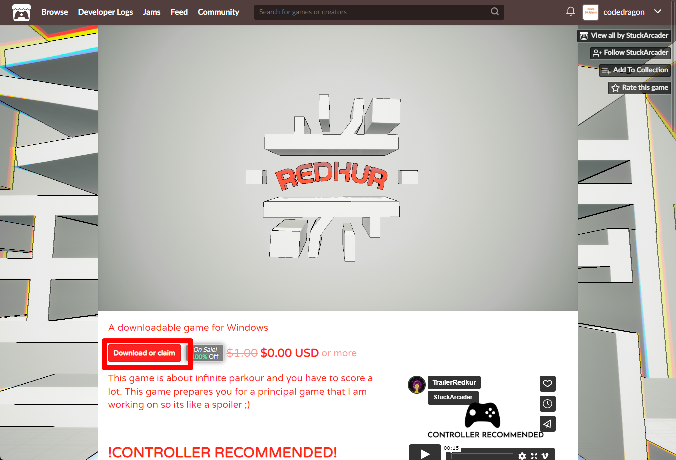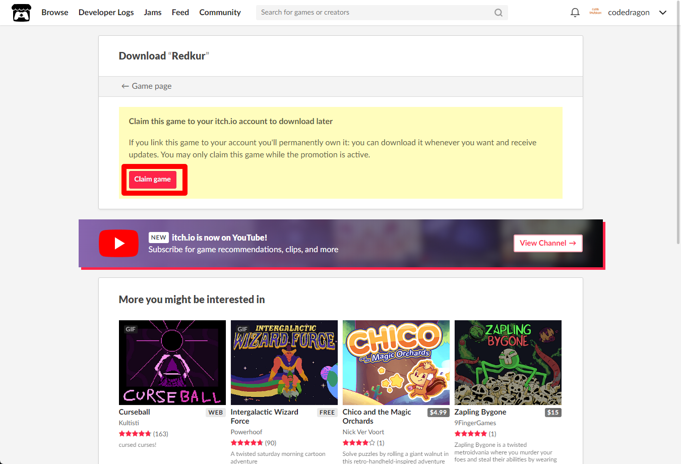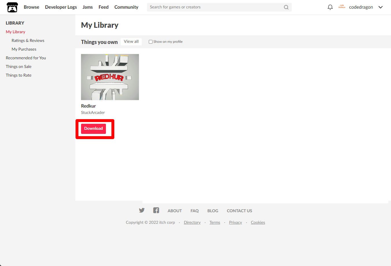 [Claim game]을 클릭하면 "Redkur" 게임이 나의 게임 라이브러리에 추가되고 설치파일을 다운받을 수 있는 페이지로 이동됩니다.
