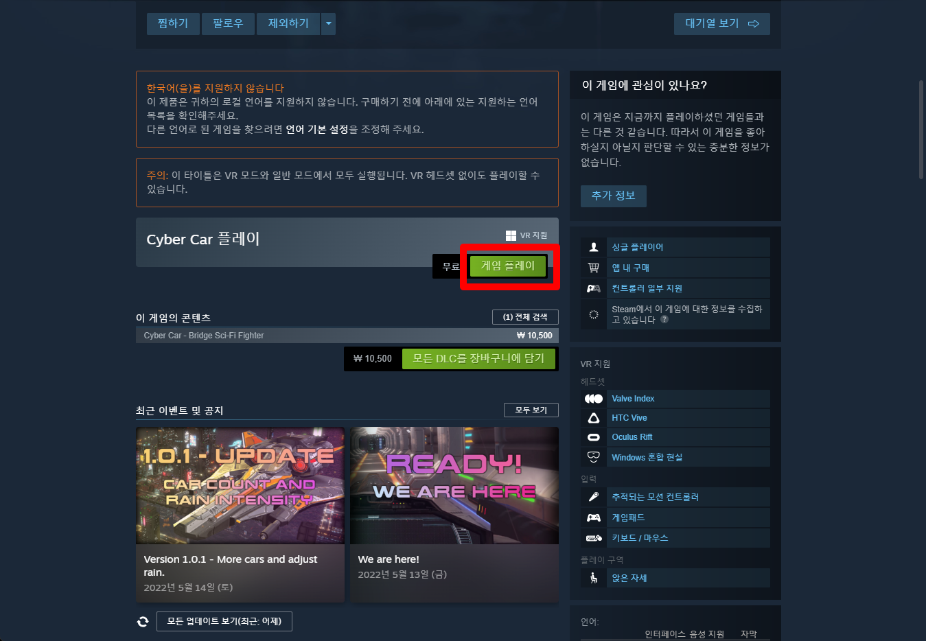 "Cyber Car" 페이지를 내려 [게임 플레이]를 클릭하면 됩니다.