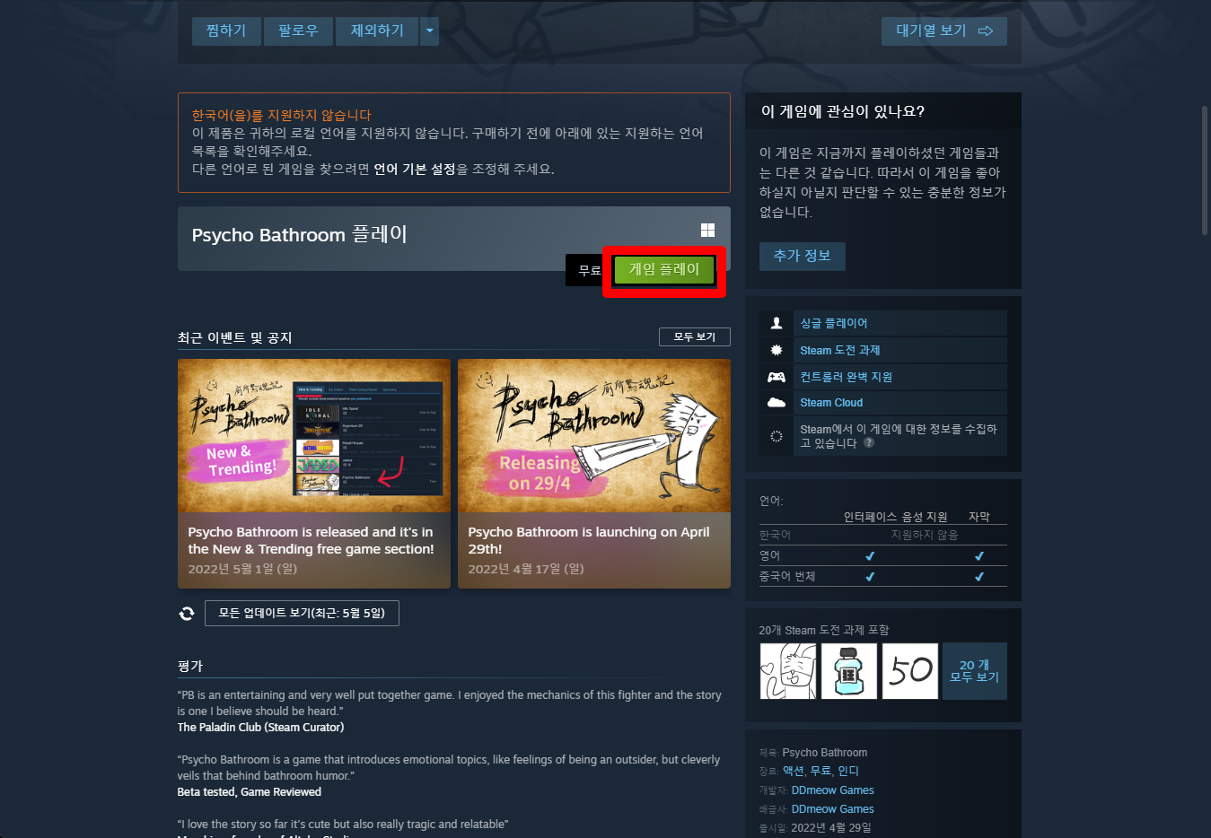 "Psycho Bathroom" 페이지를 내려 [게임 플레이]를 클릭하면 됩니다.