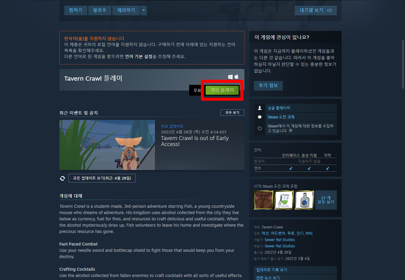 "Tavern Crawl" 페이지를 내려 [게임 플레이]를 클릭하면 됩니다.