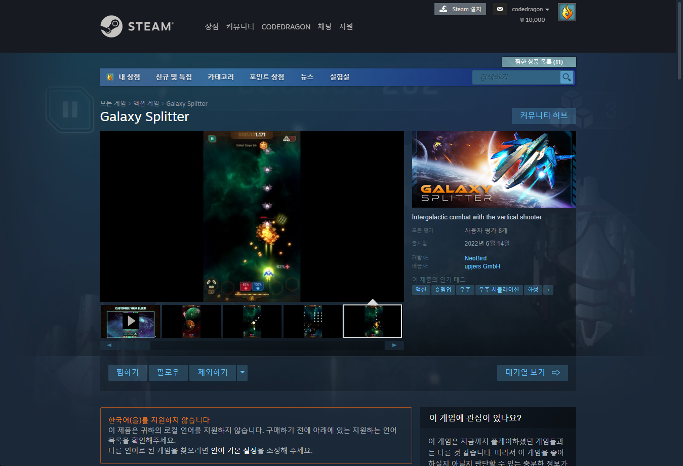 "Galaxy Splitter" 스팀 페이지 입니다.