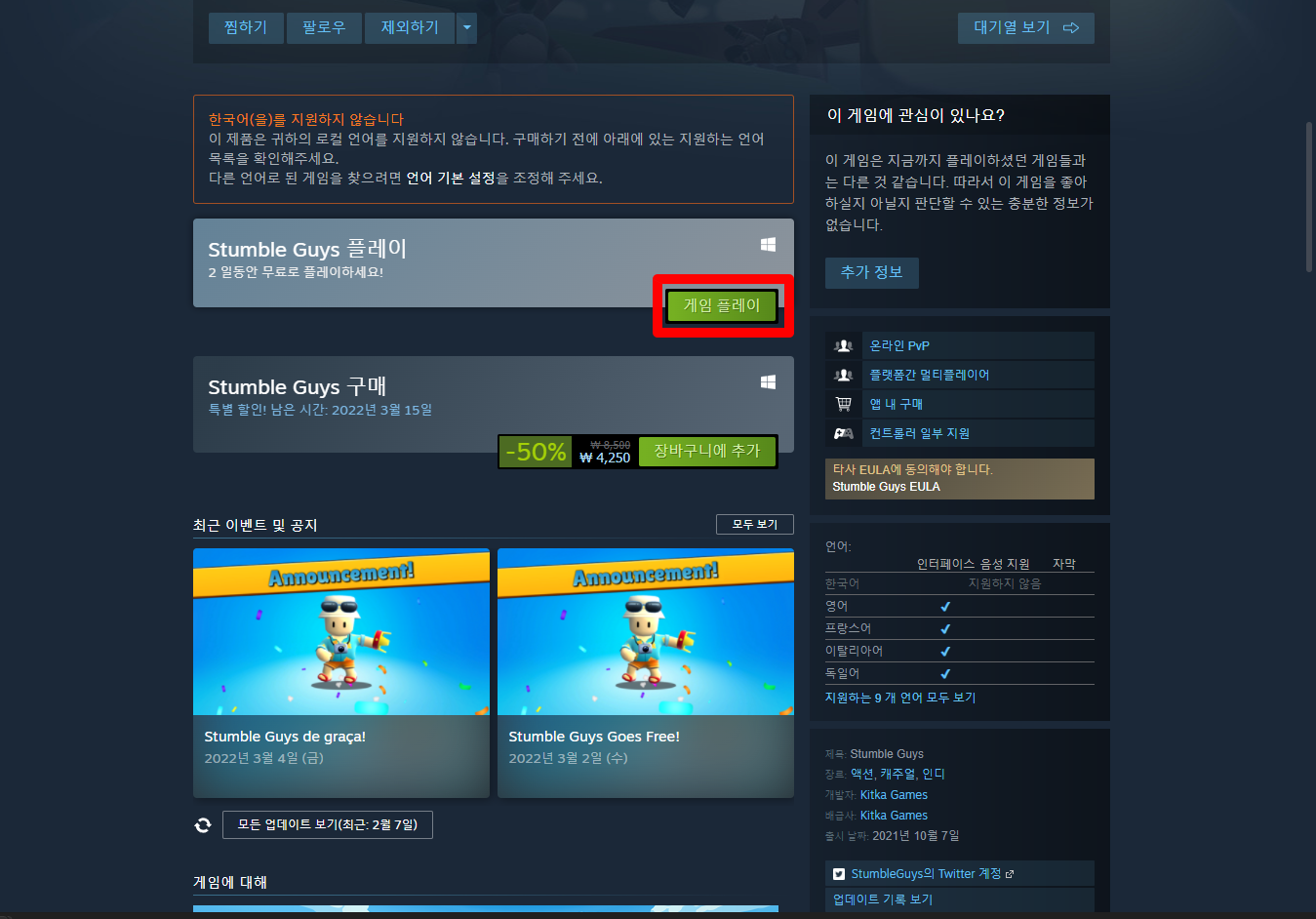 "Stumble Guys" 게임페이지를 조금 내려서 [게임 플레이] 버튼을 클릭하면 됩니다.