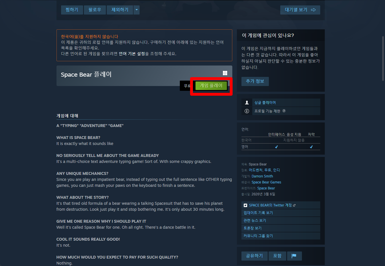 "Space Bear" 페이지를 내려 [게임 플레이]를 클릭하면 됩니다.
