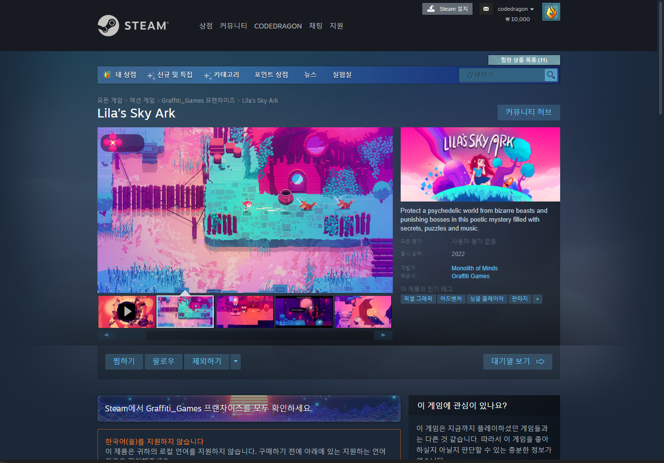 - "Lila's Sky Ark" 스팀키 등록하기; 활성화하기
