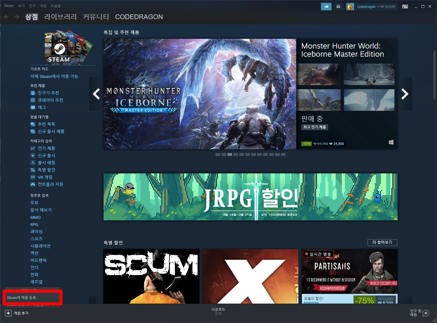 나오는 메뉴에서 [Steam에 제품 등록]을 클릭합니다.