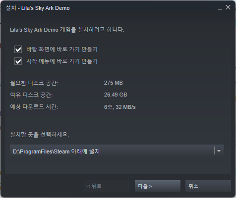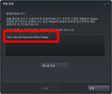 "Lila's Sky Ark" 게임명이 표시되고 등록이 완료됩니다.