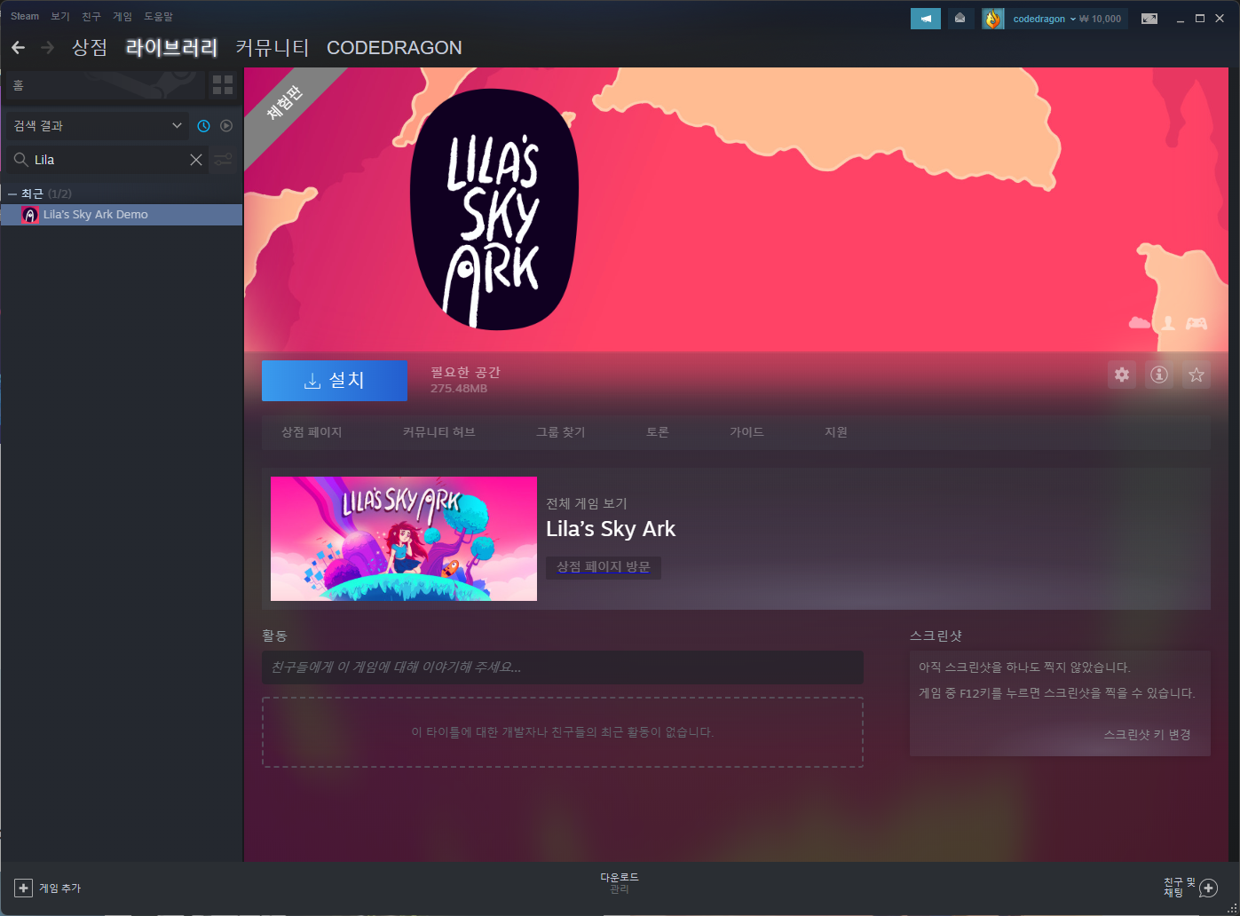 나의 게임 라이브러리에서 등록한 "Lila's Sky Ark" 항목을 확인할 수 있습니다