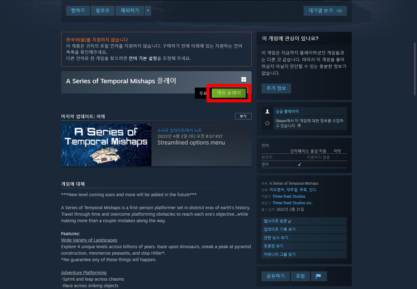 "A Series of Temporal Mishaps" 페이지를 내려 [게임 플레이]를 클릭하면 됩니다.