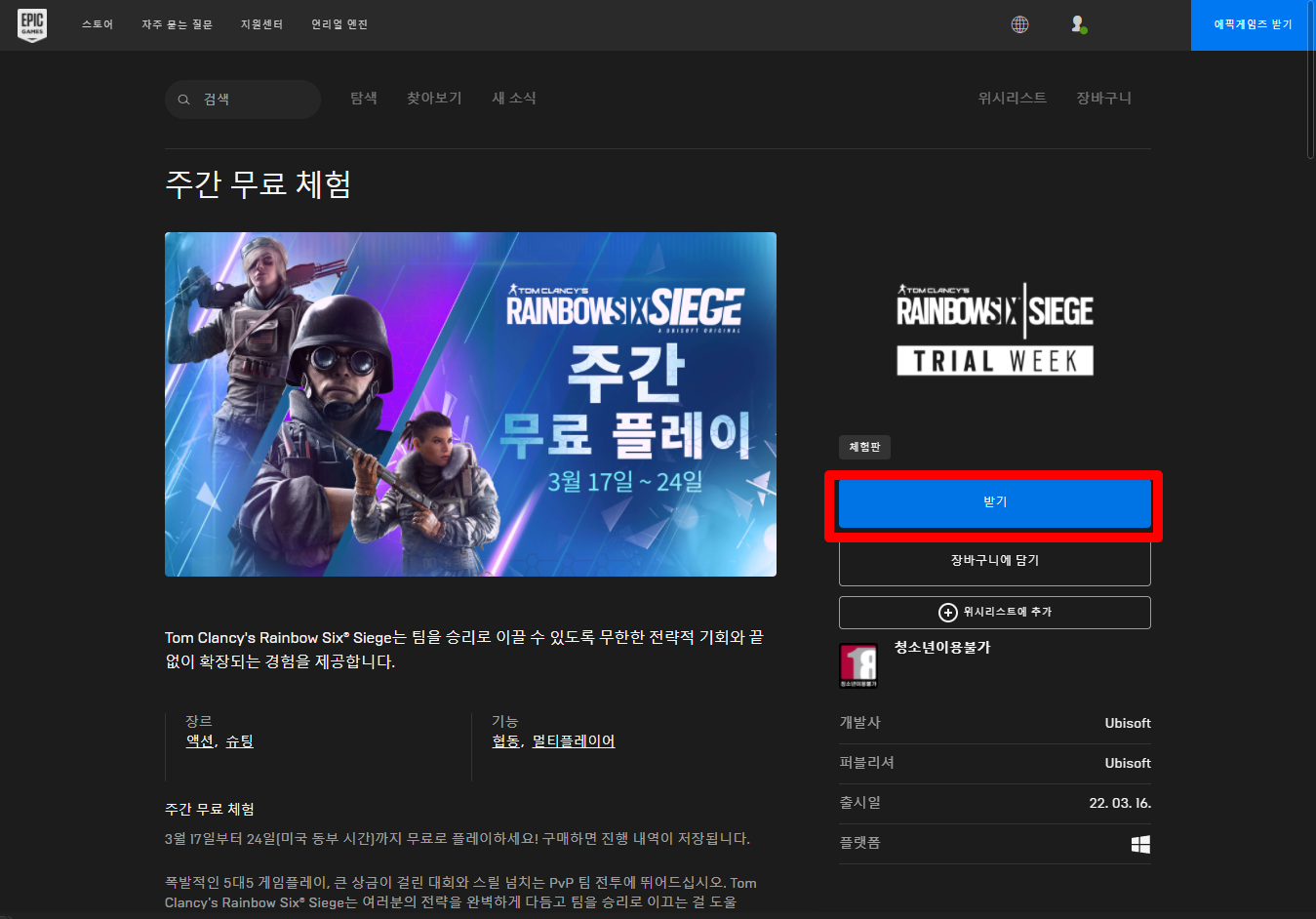 "Tom Clancy's Rainbow Six Siege" 게임 페이지 Epic 에픽
