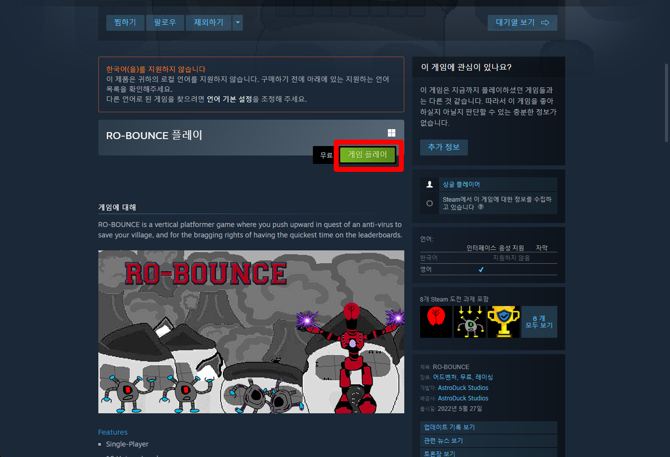 "RO-BOUNCE" 페이지를 내려 [게임 플레이]를 클릭하면 됩니다.