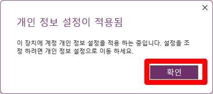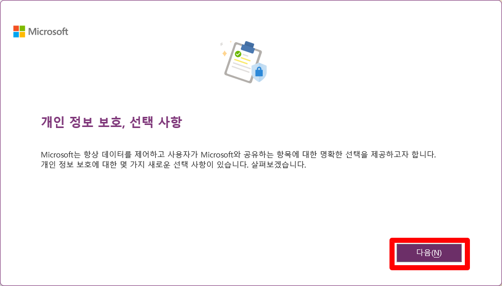 개인 정보 보호, 선택사항 팝업창이 오픈되면 [다음] 클릭합니다.