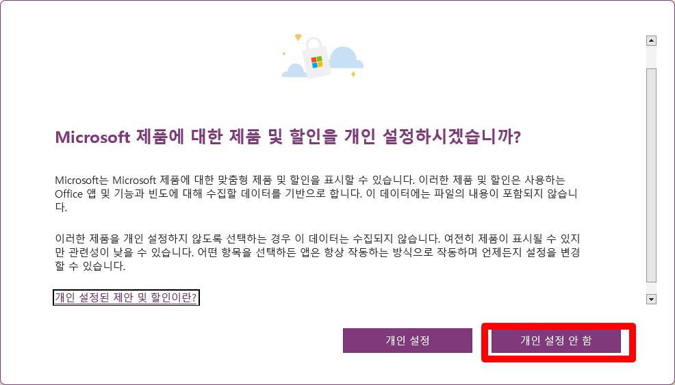 [개인 설정 안함] 클릭해서 데이터 수집되지 않도록 설정하겠습니다.