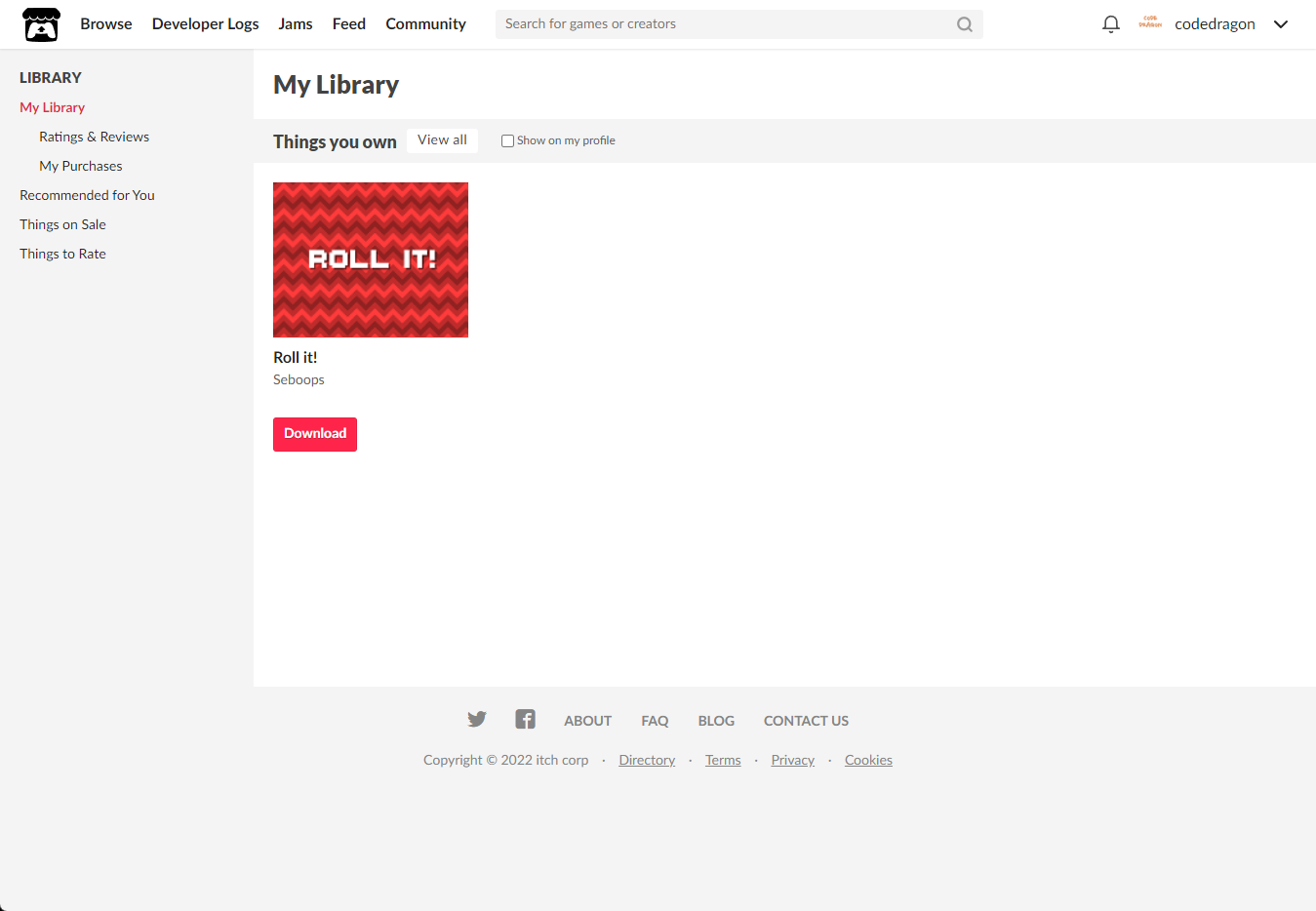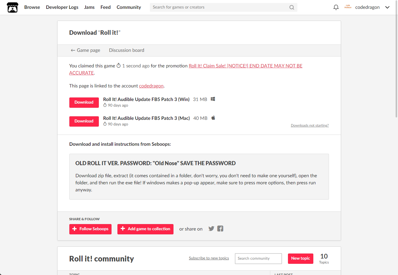 [Claim game]을 클릭하면 "Roll it!" 게임이 나의 게임 라이브러리에 추가되고 설치파일을 다운받을 수 있는 페이지로 이동됩니다.